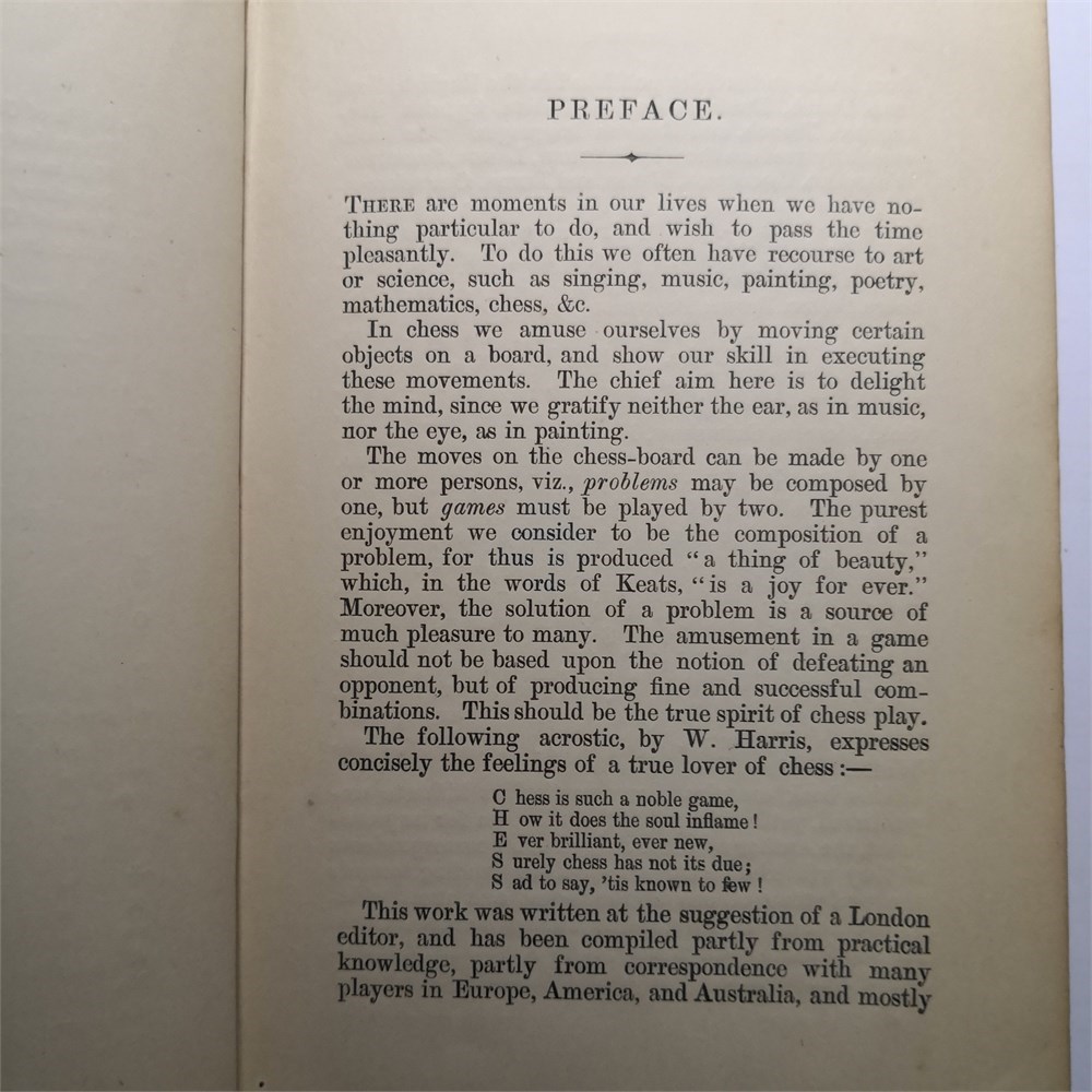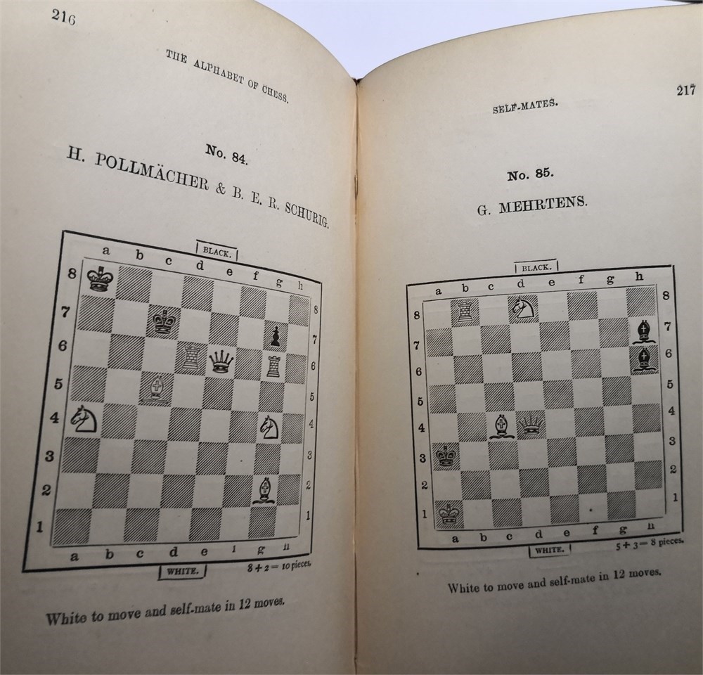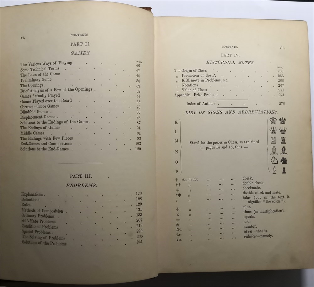 Contents: see photo 4, part 1: the elements, part 2: games, part 3:158 pages with problems in 2, 3, 4, 5 moves mate, self-mates, etc. , part 4: historical notes, index of authors.