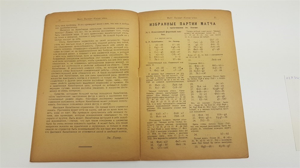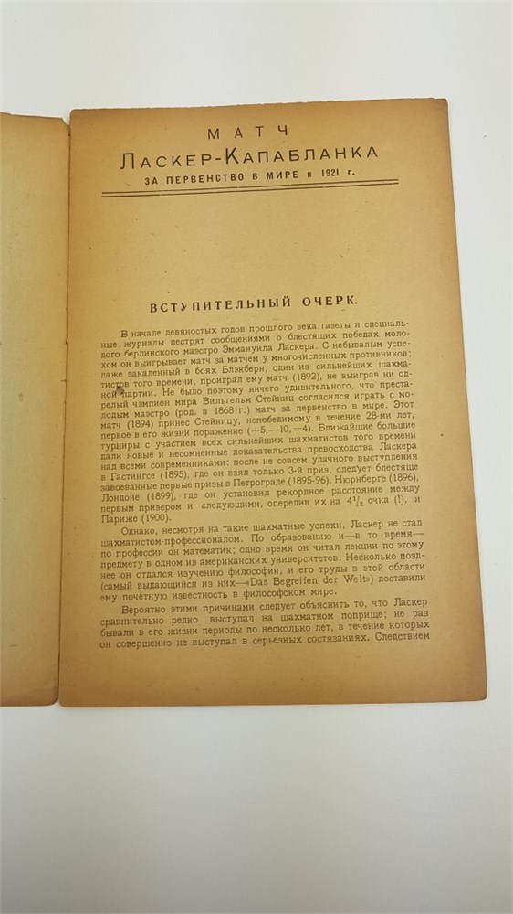 L/N 5063, S 468 Grekov N. I. Match Lasker - Capablanca for the World Championship in 1921 With a portrait of both maestros. Selected games of the match. Articles by Em. Lasker and R. Reti. Introduction, essay by N. I. Grekov. Comp. N. I. Grekov M., jury. "Chess", 1923. 16 p. with ill. 5000 copies. 1 The decisive (5th, 10th, 1'1, 12th) and drawn 6th games of the match with Lasker's rules are given, as well as R. Reti's articles "Lasker", "Features of Capablanca's technique", "On the Capablanca - Lasker match" (from the collection "New ideas of chess game") and an extract from Em. Lasker's book "My match with Capablanca".