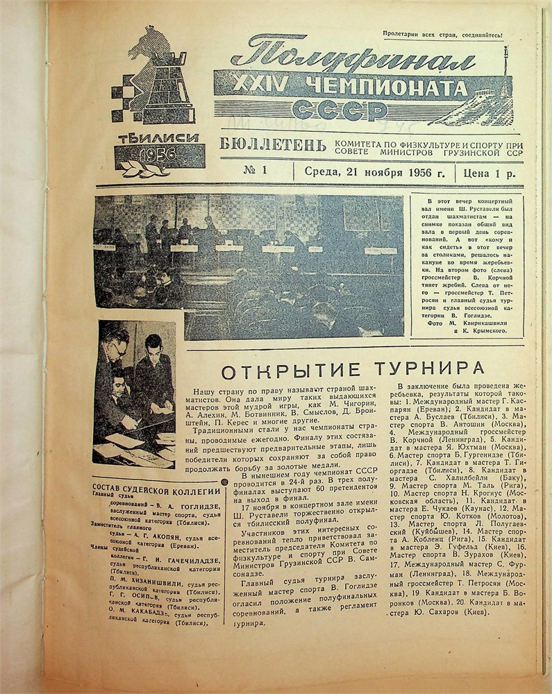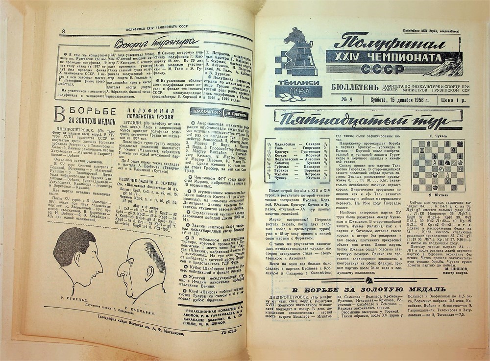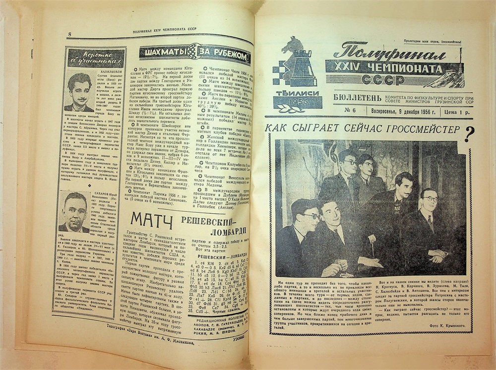S 1045 Semi-final of the XXIV USSR Championship. Tbilisi. 4956. Bulletin of the Committee on Physical Culture and Sports under the CM of the Georgian SSR. Tbilisi, November 21- December 22, 1956 'No. 1-40. 'All games of the semi-final (I-T. Petrosyan), reviews of rounds, information about the participants and other materials of the tournament. A series of articles from the history of chess in Georgia, etc.