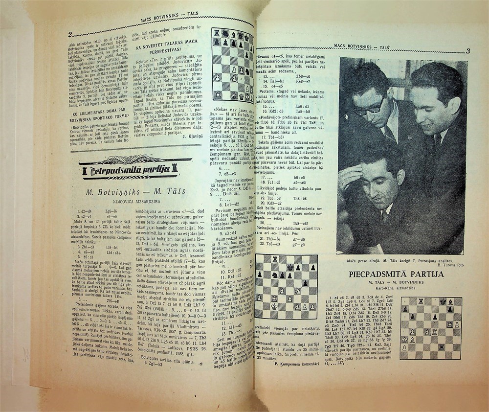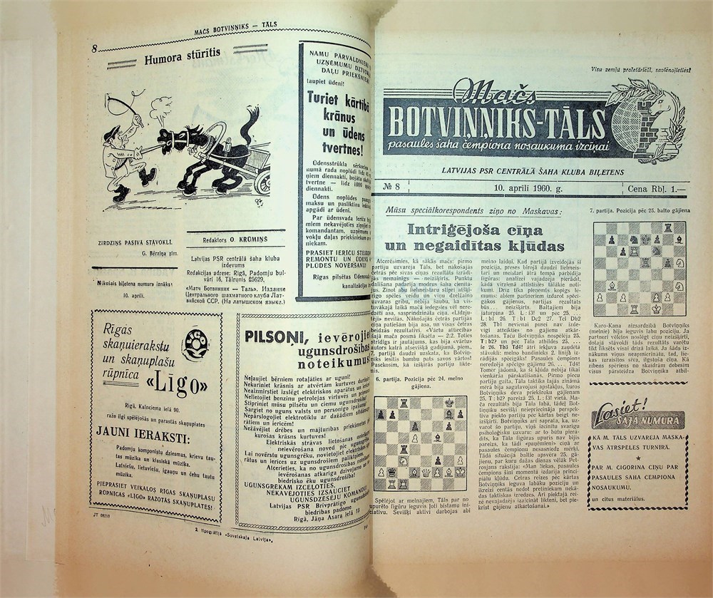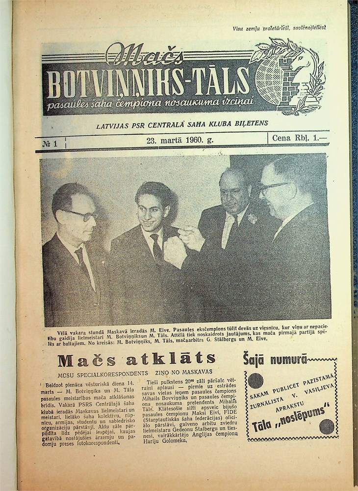 S 1070 Macs Botvinniks - Tâls pasaules Saha cempiona nosaukuma izeinai. [The Botvinnik-Tal Match. Competition for the Title of World Chess Champion]. LPSR Central Chess Club Biletens. Riga, 23. maria-20. maijam 1960. Nr. 1-20. In Latvian, lang. The weight of the match game (with comments), L. Roy's article "World Champion M. Botvinnik", V. Vasiliev's essay "The Secret of Tal" and other match materials. Information on the history of chess and the struggle for the world championship, on chess competitions abroad, etc.