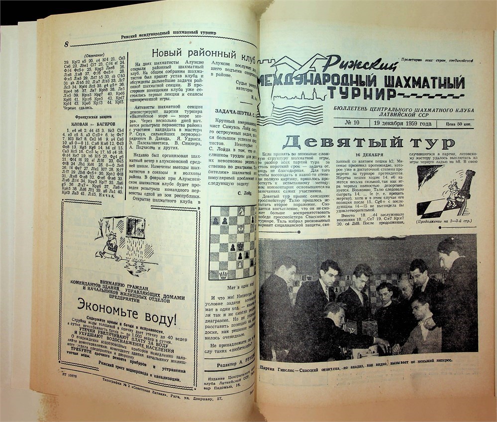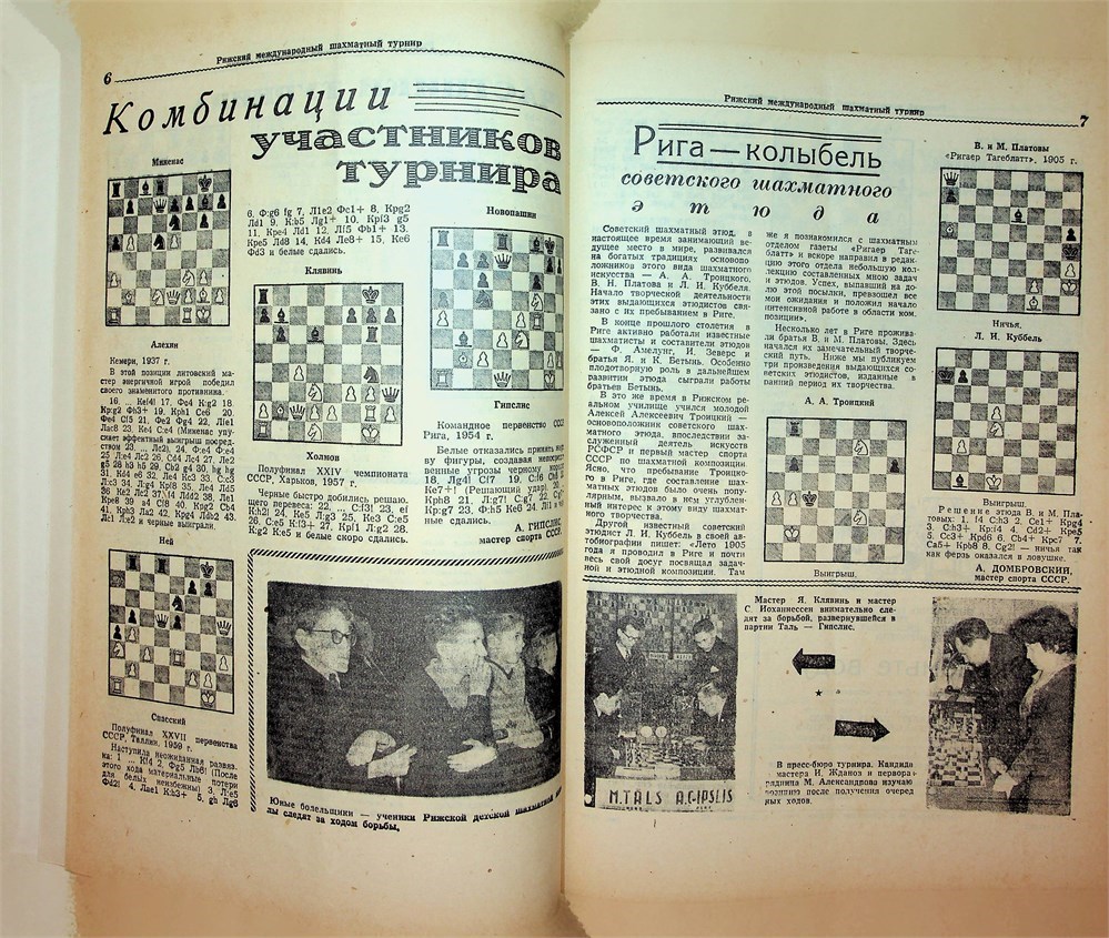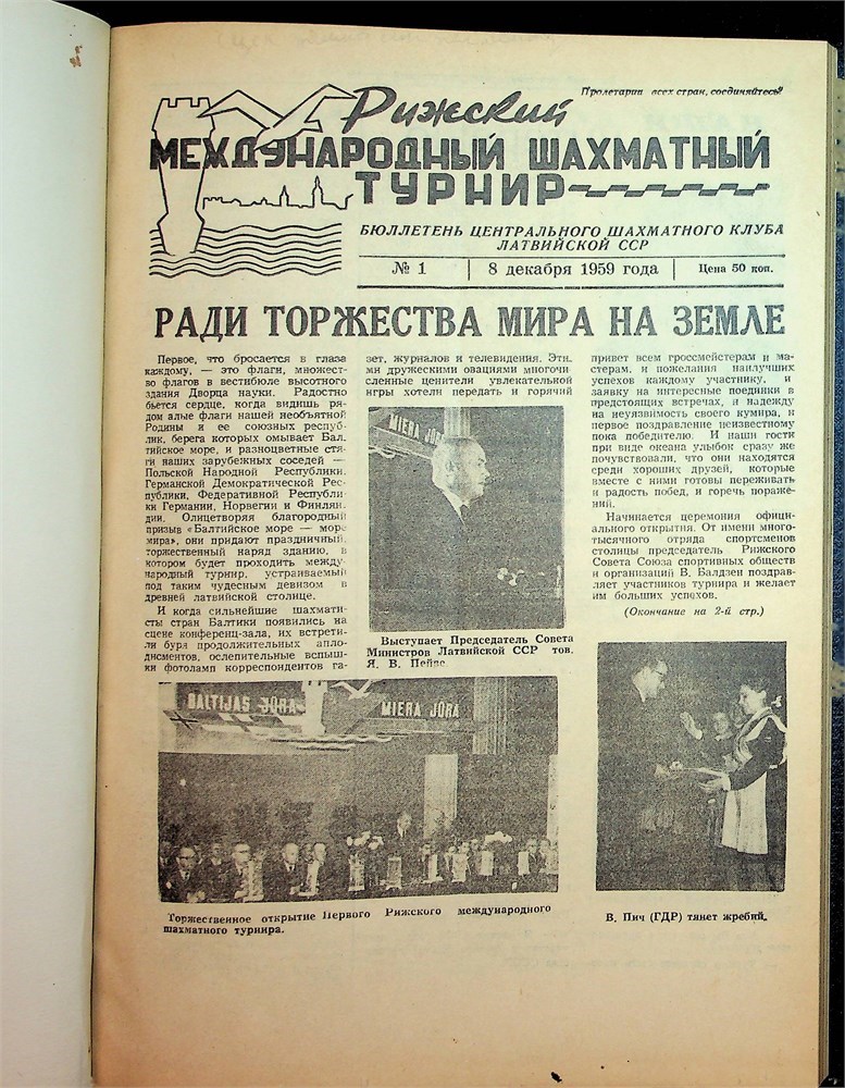 Bulletin Riga International Chess Tournament. December 8-27, 1959. X° 1-15. All games of the first international tournament of the Baltic countries (I - B. Spassky), reviews of rounds, materials about the participants. Articles on the history of chess in the Baltics, on chess life in Latvia, as well as in Poland and the FRG. Selected games of the semi-finals of the XXVII USSR Championship in Yerevan and Tallinn S1065