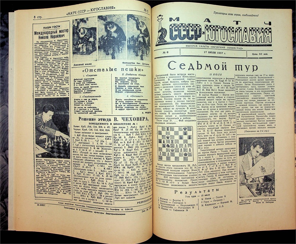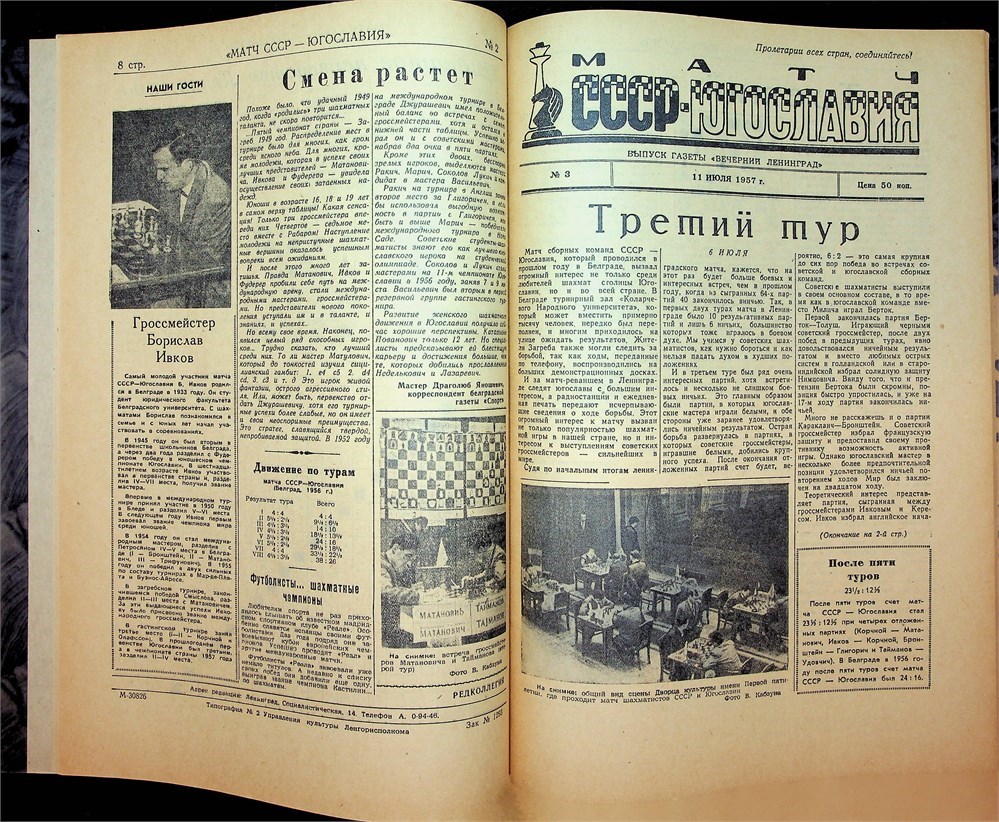USSR vs. Yugoslavia Match. Newspaper issue "Veche. Leningrad". L., July 5-19, 1957. No. 1-8. All games of the match, reviews of rounds, information about the Yugoslav participants in the match, article by A. Tolush "Openings of the match" (No. 8), etc. Articles about other competitions in 1957 Sacharov 1052