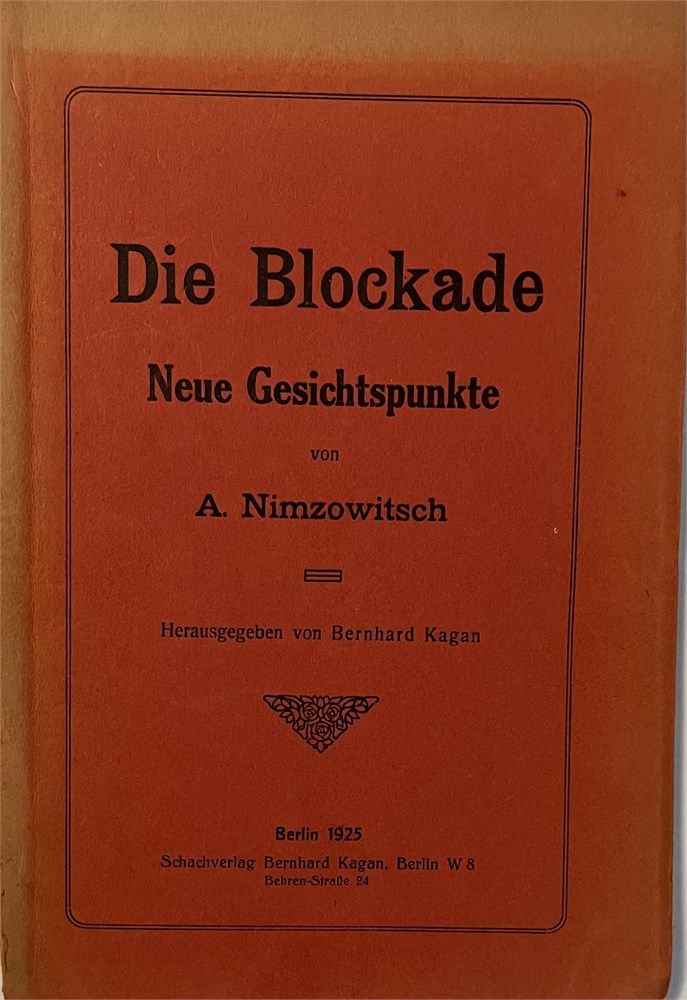 Nimzowitsch, A Die Blockade. Neue Gesichtspunkte. Herausgegeben von Bernhard Kagan. 1st edition! 49+(1)p. L/N 1432 Schachverlag Bernhard Kagan Berlin 1925 s.c. VG 40,00 €