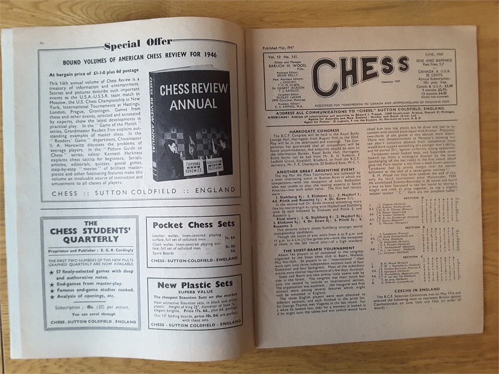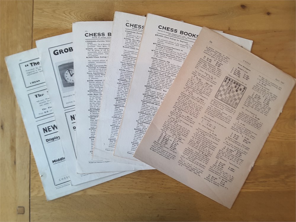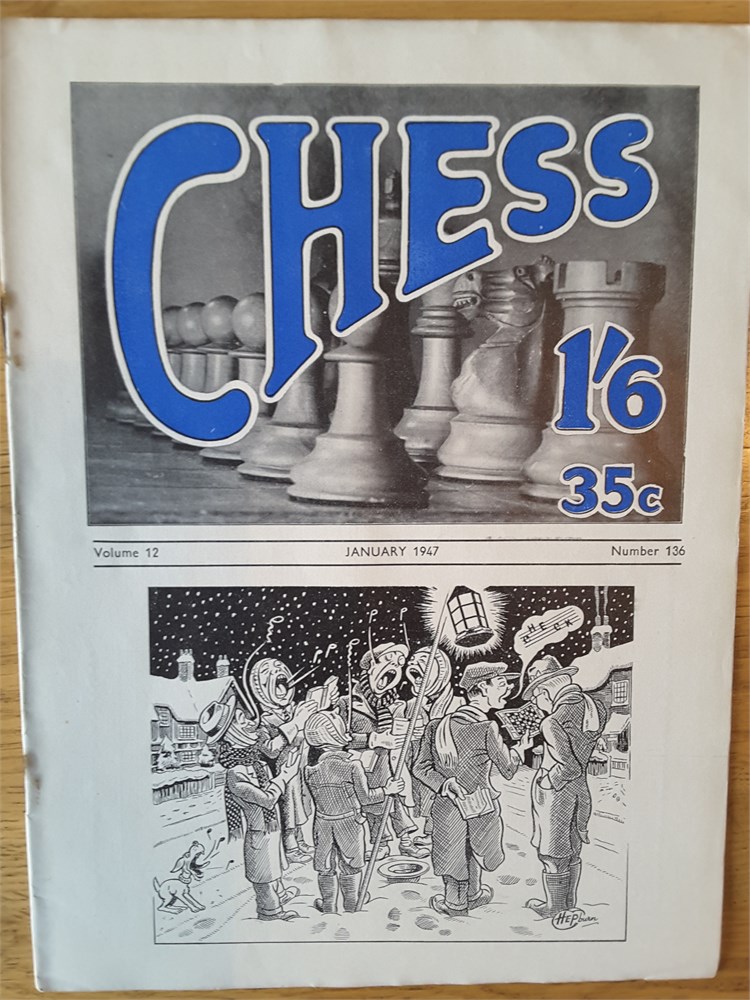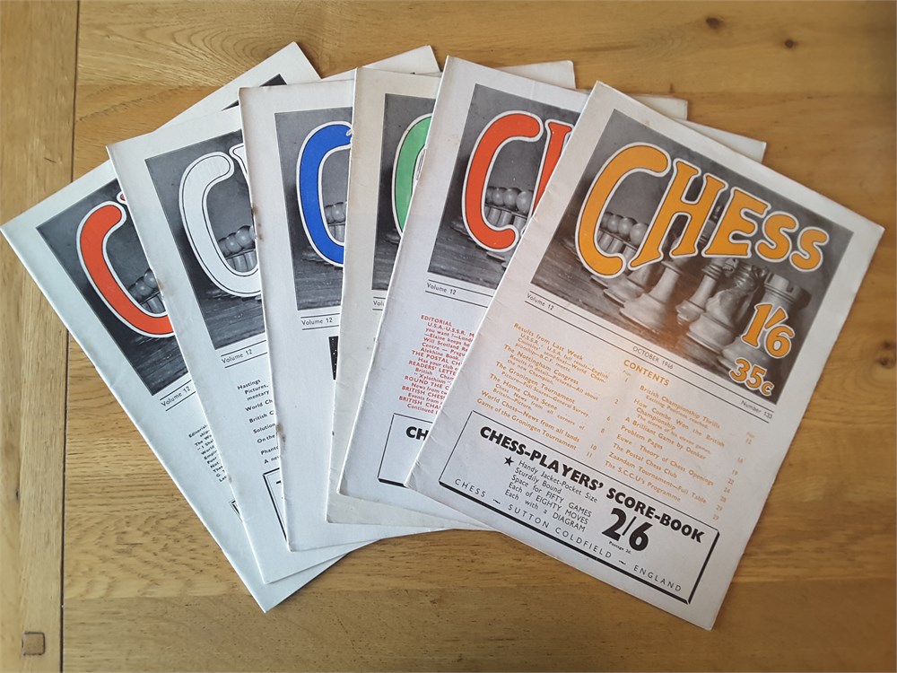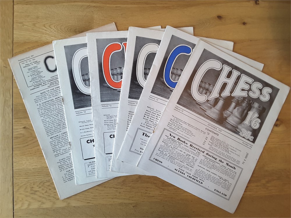 A complete run of the twelve "CHESS, Sutton Coldfield" magazines for Vol 12 (part 1946 and part 1947). They are Issue Numbers 133-144, inclusive and are in Good overall condition for their age (apart from Issue Number 139 which is complete but has no cover). Each magazine has around 24 large pages. The covers have age-related scuffing, creasing and light staining but internally they are all clean and inscription free apart from the very occasional pencil tick at the start of annotated games. Staples have rusted but not bled. Pages have browned slightly from the poorer quality of paper available so soon after WW2. Packed full of contemporary reporting from the latest tournaments of the day! Includes a facsimile index.Games are given in English descriptive notation. Any questions, please just ask.