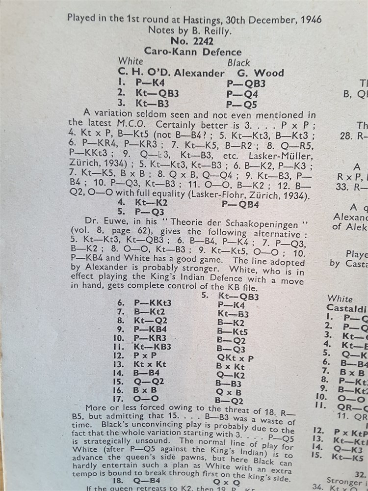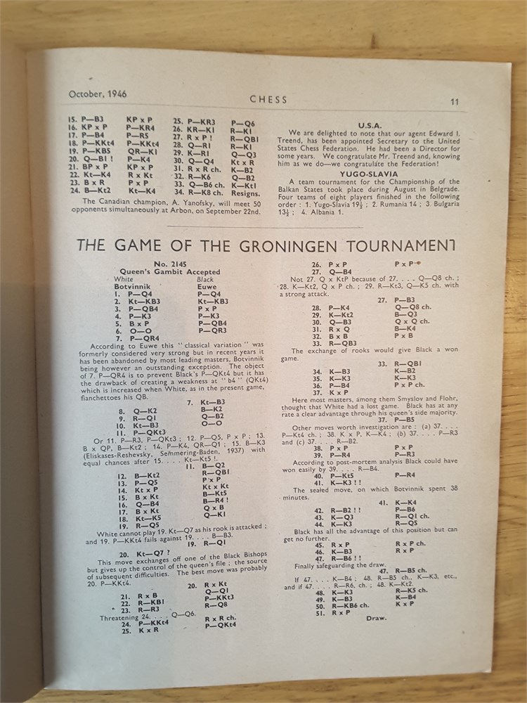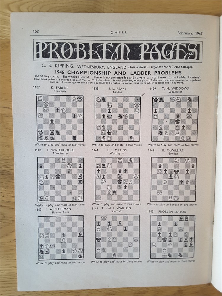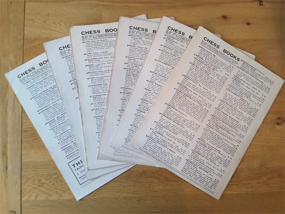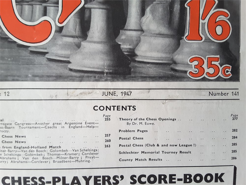 A complete run of the twelve "CHESS, Sutton Coldfield" magazines for Vol 12 (part 1946 and part 1947). They are Issue Numbers 133-144, inclusive and are in Good overall condition for their age (apart from Issue Number 139 which is complete but has no cover). Each magazine has around 24 large pages. The covers have age-related scuffing, creasing and light staining but internally they are all clean and inscription free apart from the very occasional pencil tick at the start of annotated games. Staples have rusted but not bled. Pages have browned slightly from the poorer quality of paper available so soon after WW2. Packed full of contemporary reporting from the latest tournaments of the day! Includes a facsimile index.Games are given in English descriptive notation. Any questions, please just ask.