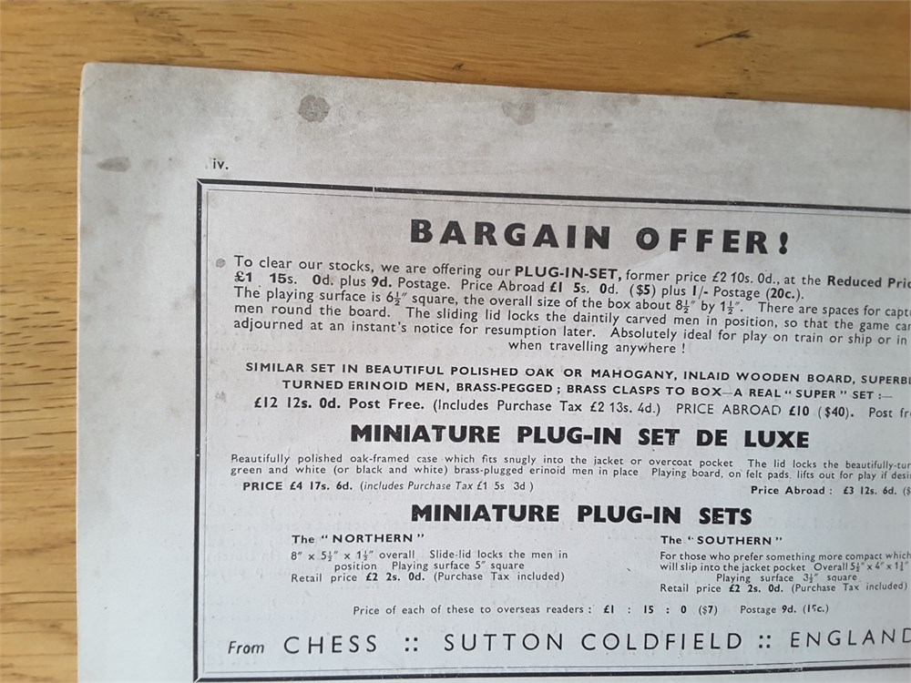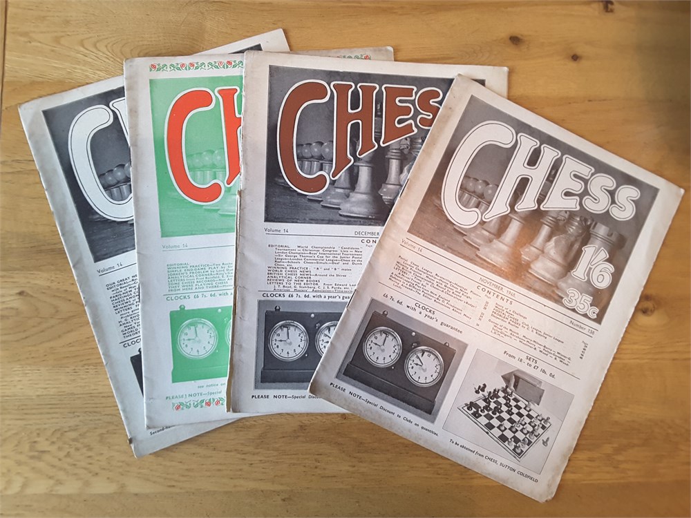 Nine vintage "CHESS, Sutton Coldfield" magazines for Vol 14 (part 1948 and part 1949). They are Issue Numbers 158-168, inclusive (#168 was a "Triple Issue"). These magazines are in Fair condition and are suitable as reading copies only. Most of the staples have rusted but not bled. Please be aware that one of these magazines (#159) is in quite a fragile state and its covers look to be about to become detached from their staples. There are postal numbers in pencil on the rear of some issues but, internally, they all appear to be clean and inscription and annotation free. PLEASE NOTE: All the covers have quite heavy dust staining and age-related scuffing (see scans) plus some creasing. AS A BONUS, Issue Numbers #165 and #166-8 have the first 40 pages between them of the great Groningen, 1946 tournament supplement. Packed full of contemporary reporting from the latest tournaments of the day! Games are given in English descriptive notation. Any questions, please just ask.