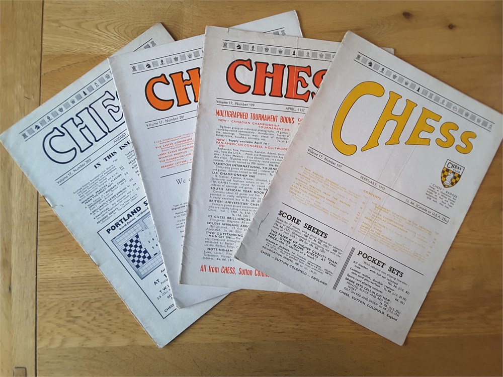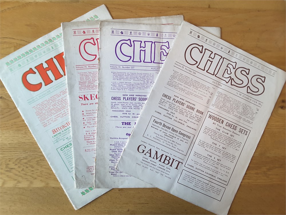 Eleven vintage "CHESS, Sutton Coldfield" magazines for Vol 17 (1952) and Vol 19 (1954). They are Issue Numbers 197, 199, 201 and 203 (Vol 17) and Issue Numbers 220, 221, 223, 225, 226, 227 and 228 (Vol 19). These magazines are in Fair condition and are suitable as reading copies only. Most of the staples have rusted but not bled. There are postal numbers in pencil on the rear of some issues but, internally, they all appear to be clean and inscription and annotation free. PLEASE NOTE: All the covers have dust staining and age-related scuffing (see scans) plus some vertical creases and small dried liquid staining. AS A BONUS, all the Vol 19 issues have a supplement stapled in the middle of each magazine which I assume to be the Zurich 1953 Candidates tournament. Packed full of contemporary reporting from the latest tournaments of the day! Games are given in English descriptive notation. Any questions, please just ask.