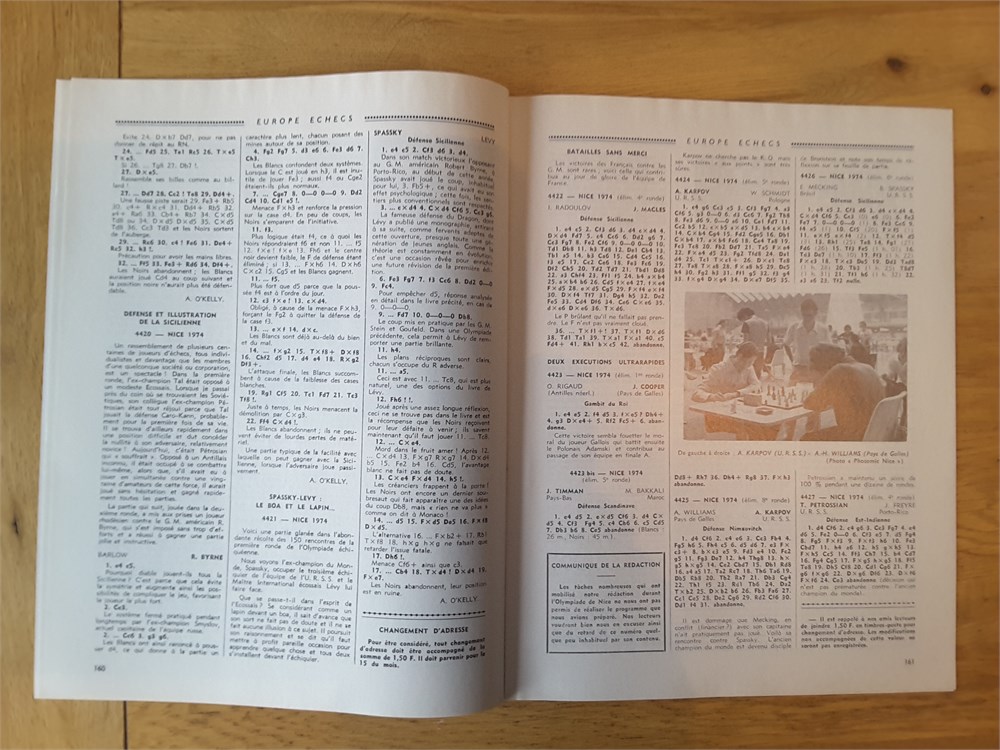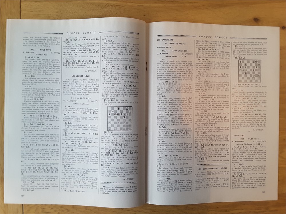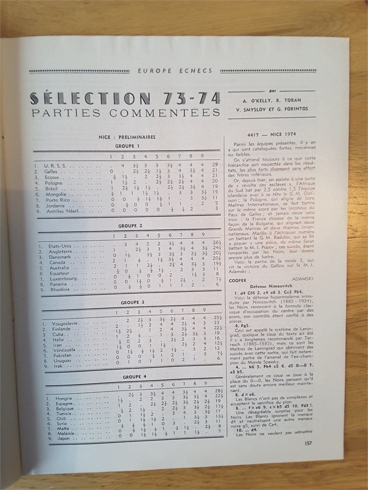 Nine "Europe Echecs" magazines from the year 1974 (Vol 16). The magazine numbers are: 182, 183, 184, 186, 187, 188, 189-190, 191 and 192. Therefore, they are missing numbers 181 and 185 from a complete 11 issue volume. The magazines are in near Very Good condition for their age. They are very clean and inscription free. Much contemporary coverage of the Nice Olympiad. PLEASE NOTE: They do, however, exhibit a musty odour from poor storage in the past. Some people find this odour quaint and authentic while others find it a put off. Page numbers vary between 20-25 large pages per issue. In French language and algebraic notation. Condition Rating: 7.5/10. Any questions, please just ask.