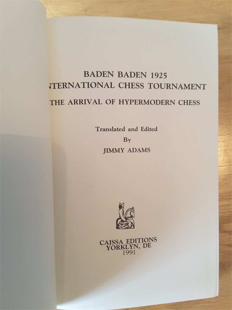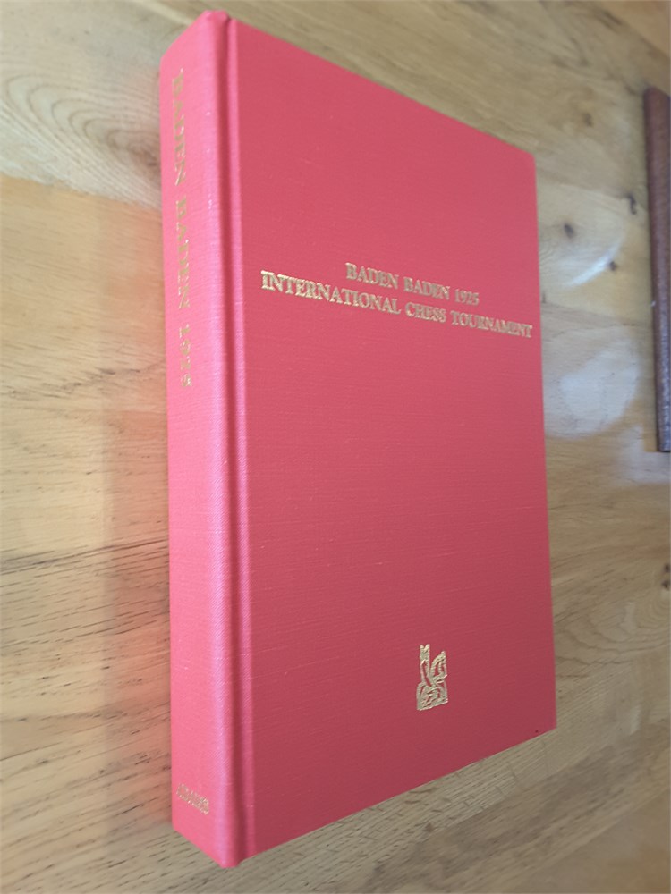 "Baden Baden 1925 International Chess Tournament" by Jimmy Adams. Published in hardback by Caissa Editions in 1991. First Edition. 382pp. The book is in Very Good Plus condition for its age and is unread. It is inscription, annotation and foxing free. The red boards are very clean (a tiny area of discolouration is evident on the rear board, see scan) and the gilt lettering is still bright. Internally it is 'as new'. I have refrained from taking any pictures of this book's interior as I do not want to bend the spine back and spoil the "as published" feel. A lovely copy of a sought after modern chess volume. Games are given in algebraic notation. Further scanned images are available on request. Condition Rating: 8.5/10. Any questions, please just ask.