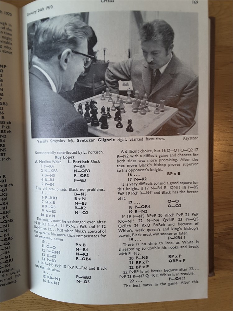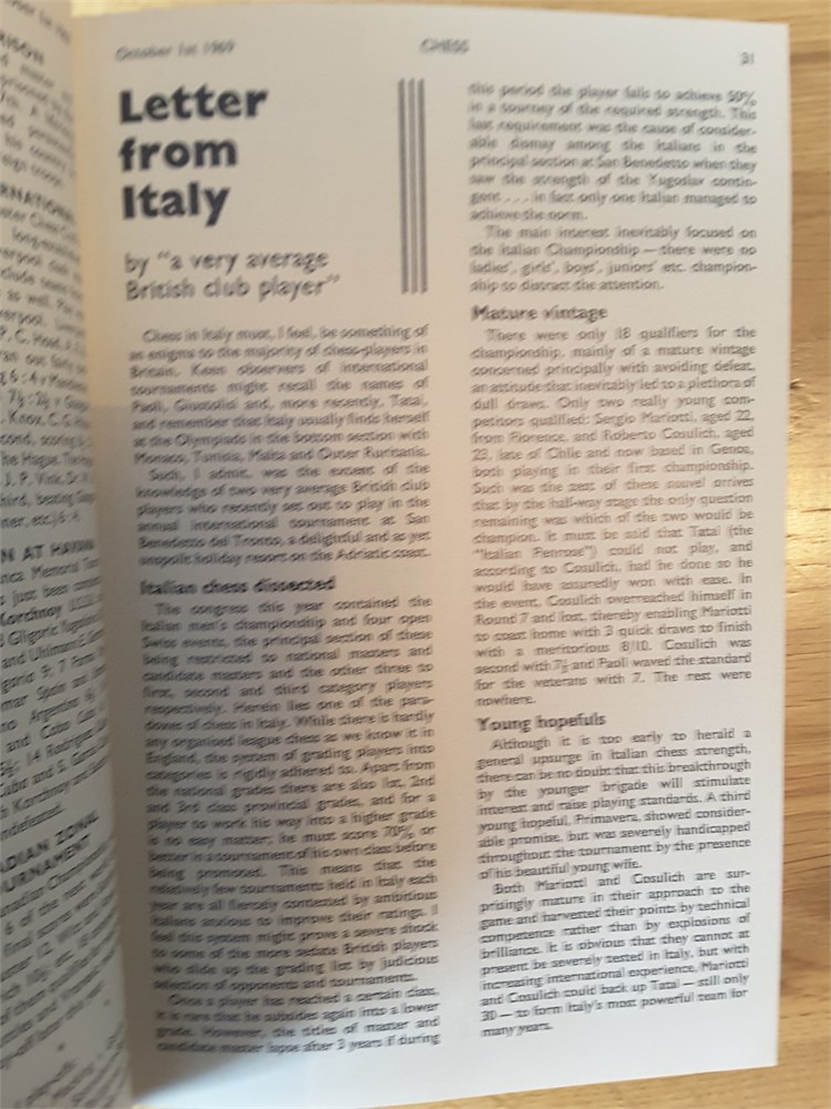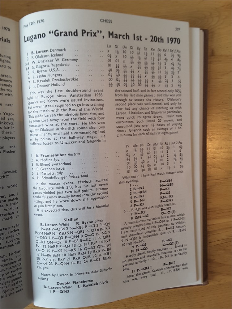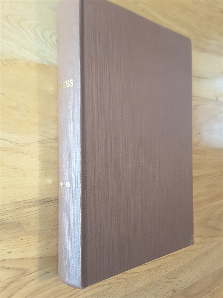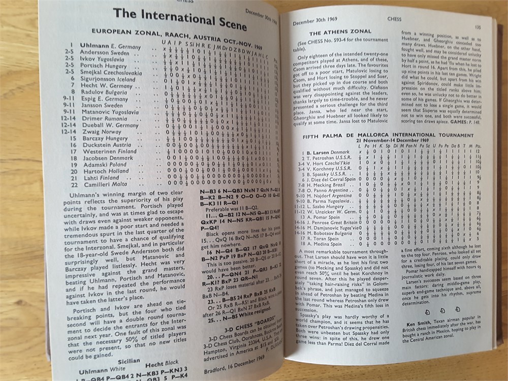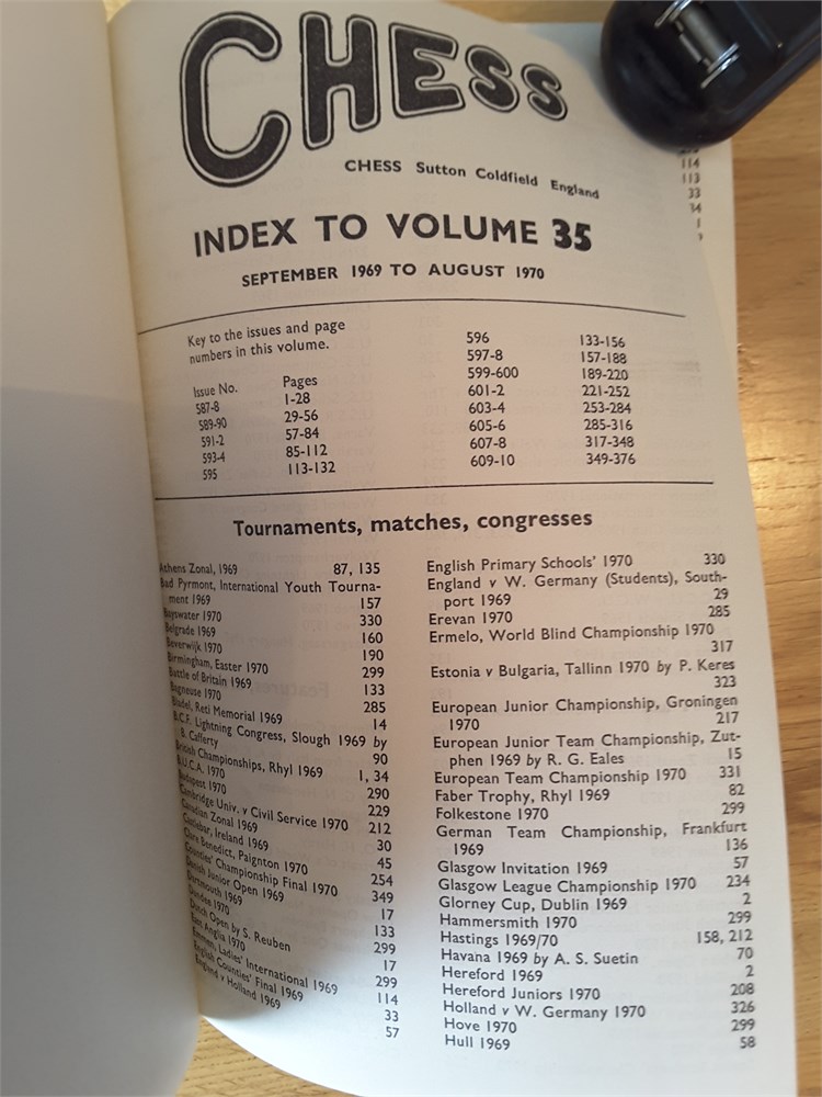 "CHESS, Sutton Coldfield. Volume 35". Bound in publisher's brown hardback. All magazines for Volume 35 (Sept 1969 - Aug 1970, Magazine Numbers 587 to 610, inclusive). 376pp + 32pp. As a bonus, issue number 611-612 has been bound in at the rear of the volume (an extra 32pp). Includes index. The volume is in Very Good condition for its age. The binding is tight and there is no shelf lean or bowing present. The covers are very clean. The gilt lettering on the spine is still strong. There is a small contact indentation at the tip of the front board (see scan). Internally the volume is very clean and appears to be inscription and annotation free. Age-related tanning evident to internal pages and edge blocks. Free of foxing. Some evidence of a musty smell to the internal pages, suggesting poor storage in the past. Some people find this quaint and authentic while others find it a put off. Games are in English descriptive notation. Further scanned images are available on request. Condition Rating: 8/10. Any questions, please just ask.