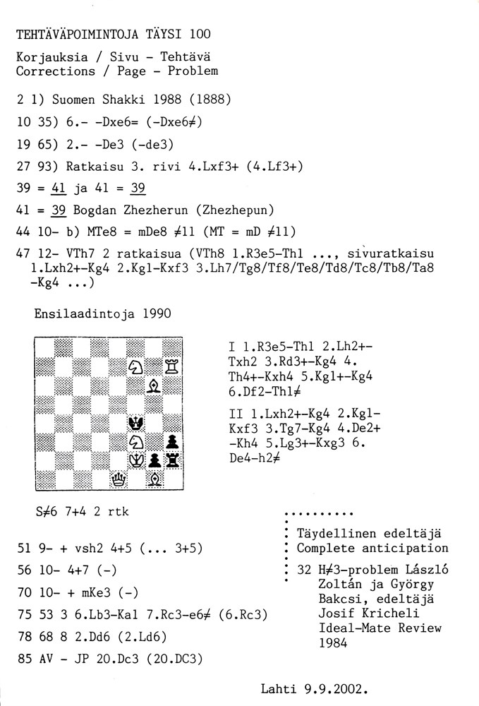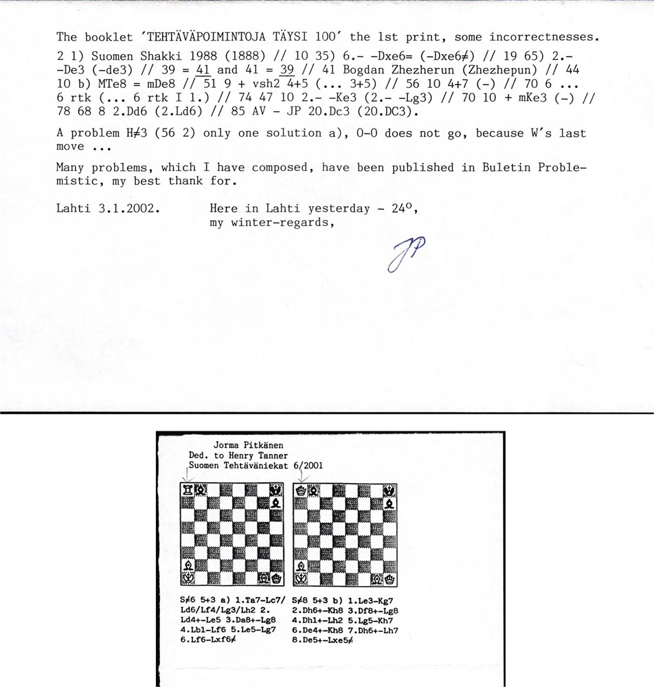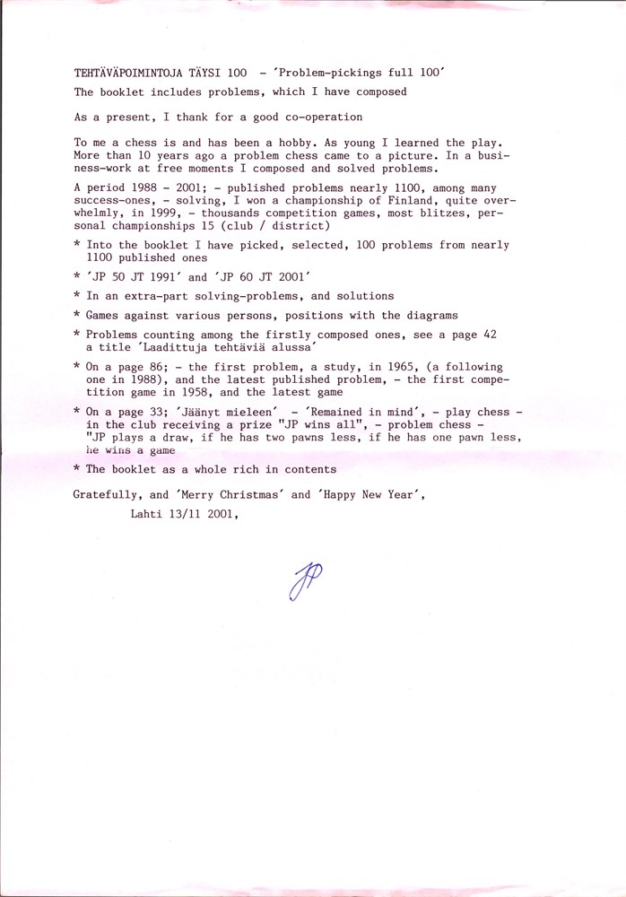 Condition: good to very good. Stamp on the first page, signature on the last page and several annotations in pencil (not unpleasant and not affecting the text at all) of the well known Romanian composer and IA-Comp arbiter, Valeriu PETROVICI. There are attached: a letter of presentation original signed by the author, J. Pitkanen, a page about "some incorrectnesses", also signed by J. Pitkanen and other 2 sheets with corrections.