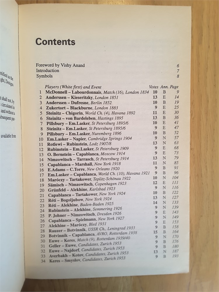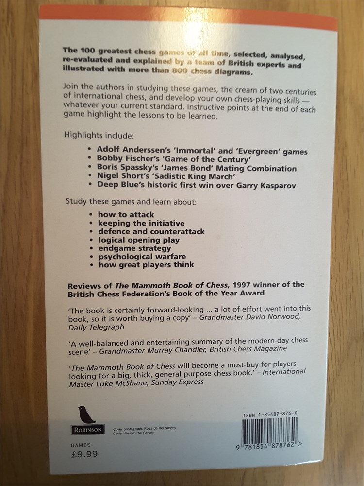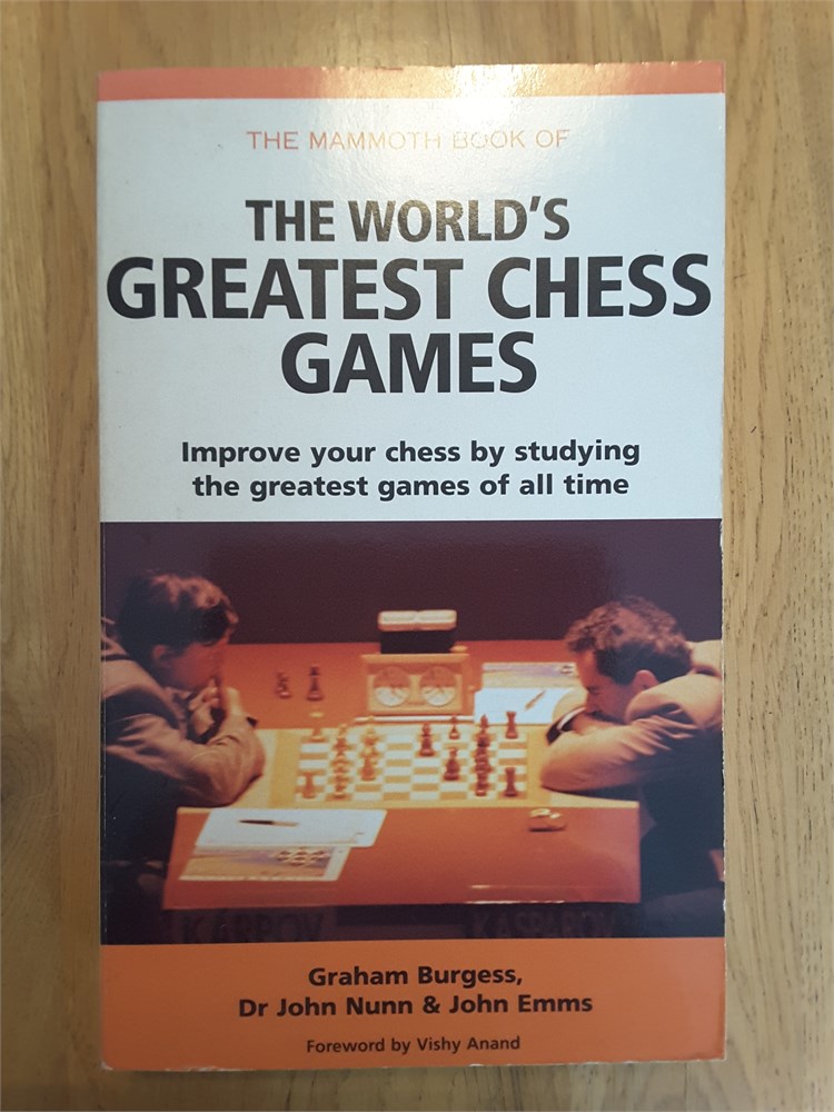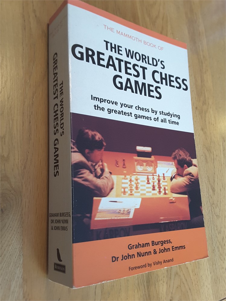 "The World's Greatest Chess Games" by Graham Burgess, John Nunn and John Emms. Published in softback by Robinson Books in 1998. 560pp. The book is in Very Good condition for its age. The covers are clean & bright. The page edge blocks are moderately tanned. Internally the volume is very clean and looks as though it has hardly been read. The internal pages are age-tanned, presumably from the use of average quality paper in publication. Games (100 from 1834 to 1997) are given in figurine algebraic notation. Condition Rating: 8/10. Any questions, please just ask.