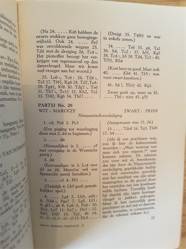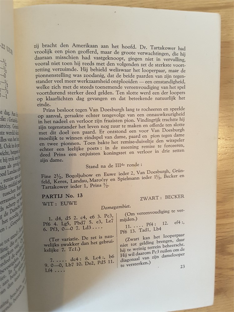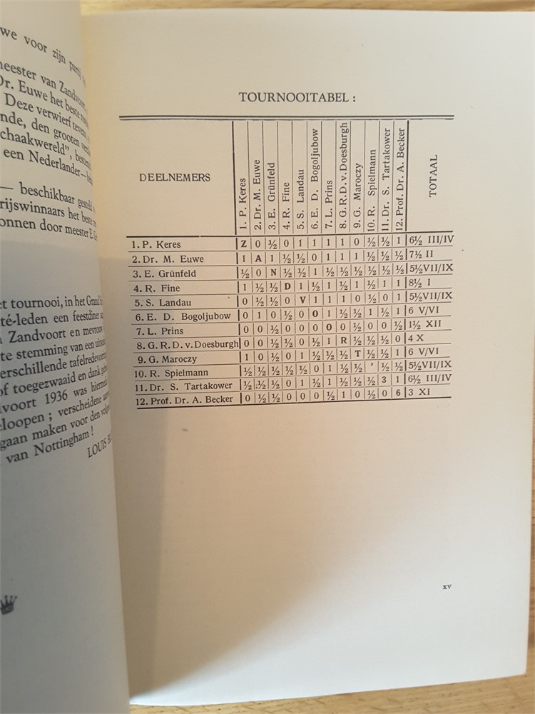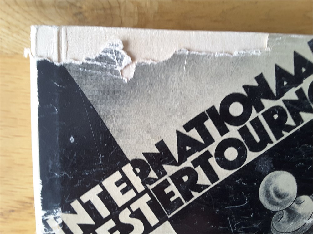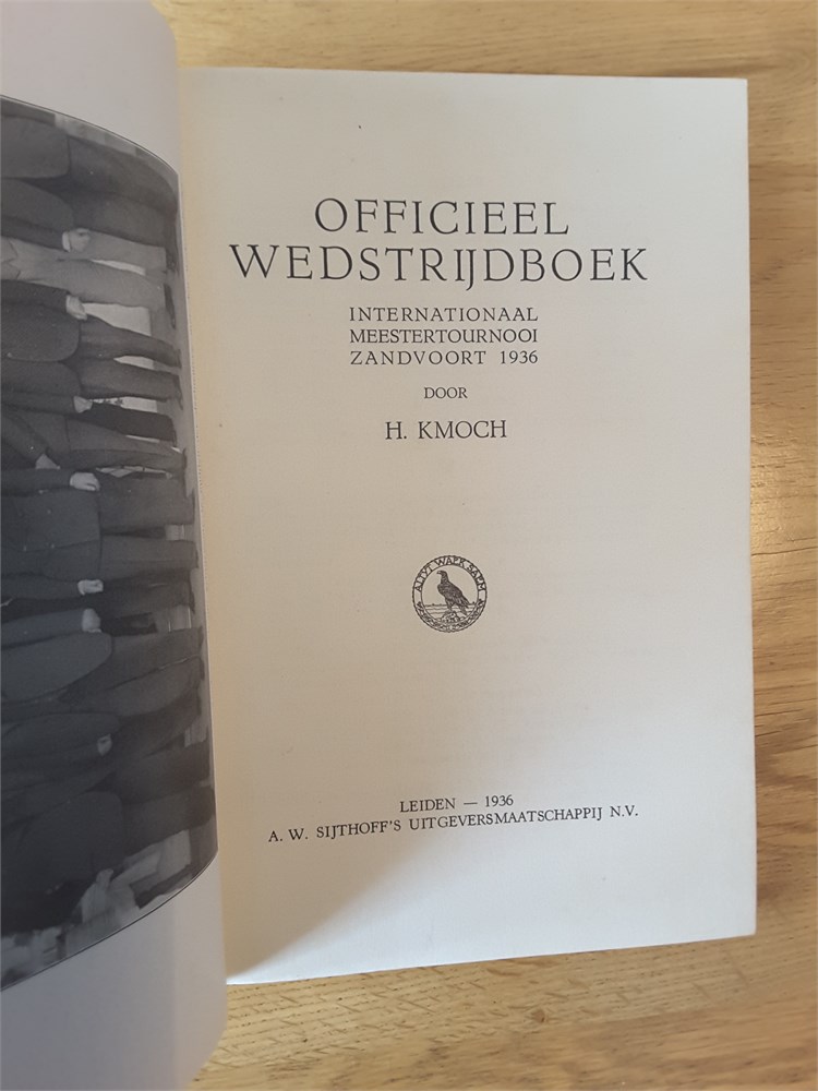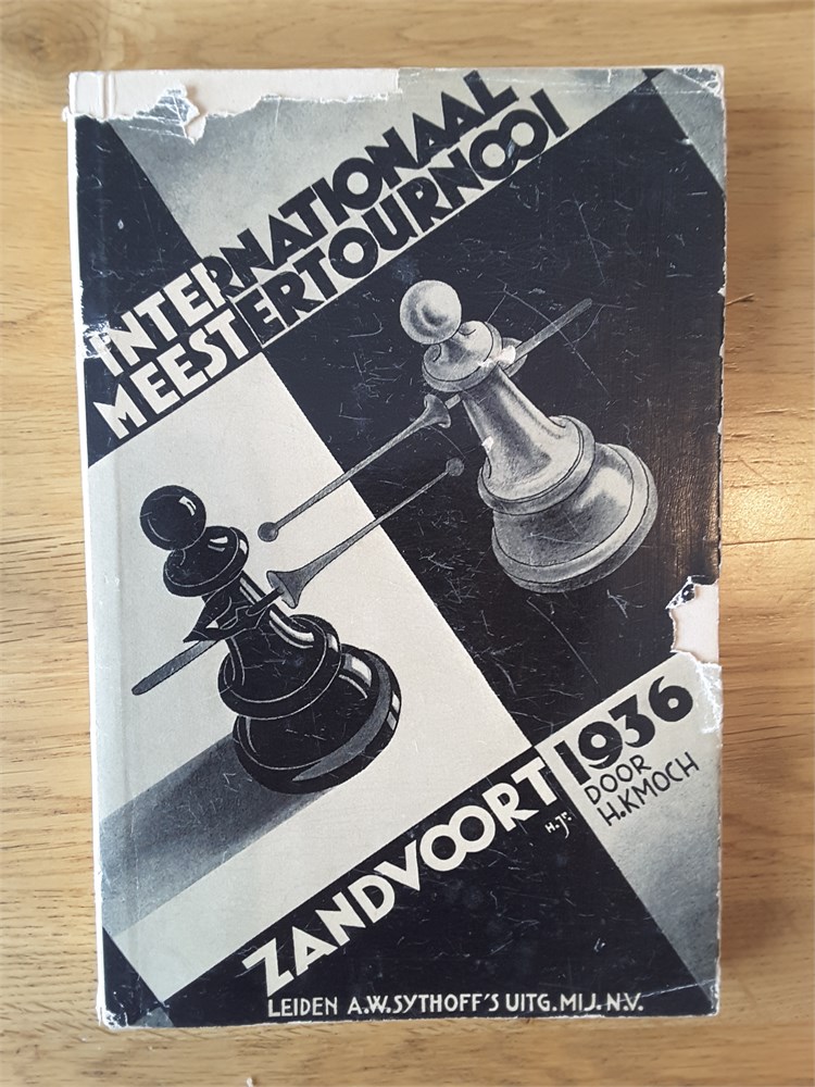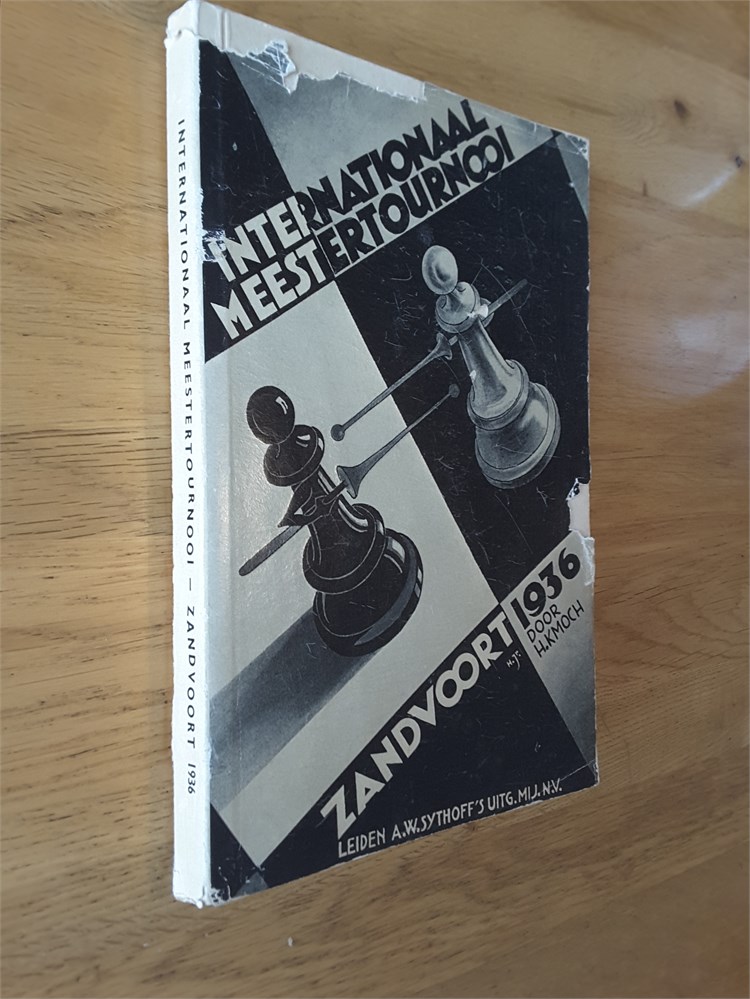 "Zandvoort [International Chess Tournament], 1936" by Hans Kmoch. Published in softback by Leiden in 1936. L/N: 5547. 105pp. In Dutch language and algebraic notation. The book is in Good Plus condition for its age. The binding is tight. The covers are clean. The page edge blocks are lightly and evenly tanned from age. Internally the book is very clean and unmarked and it has clearly been very well cared for over the years. The - scarce - dustjacket is in only Fair condition with pieces missing and short closed tears to note (see scans). The front flap of the dustjacket is only just holding on but can easily be strengthened with clear sellotape. Condition Rating: 6.5/10. Any questions, please just ask.