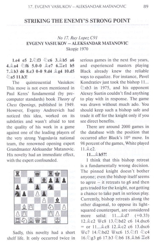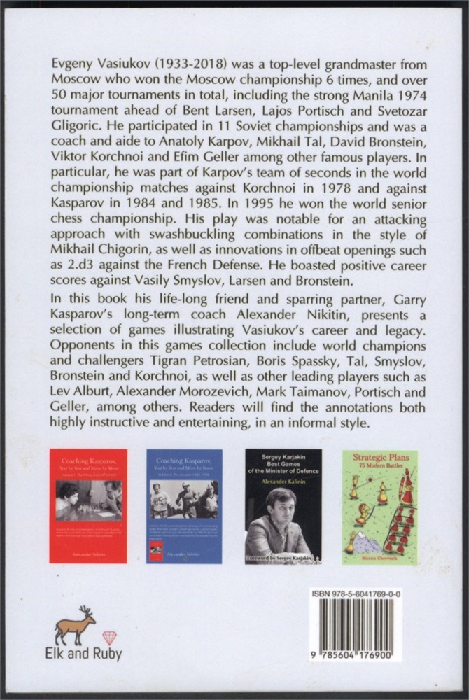 Alexander Nikitin presents 31 games illustrating Vasiukov’s career and legacy. Opponents in this games collection include world champions and challengers Tigran Petrosian, Boris Spassky, Tal, Smyslov, Bronstein and Korchnoi, as well as other leading players such as Lev Alburt, Alexander Morozevich, Mark Taimanov, Portisch and Geller, among others. Many annotations and diagrams. Some photos.