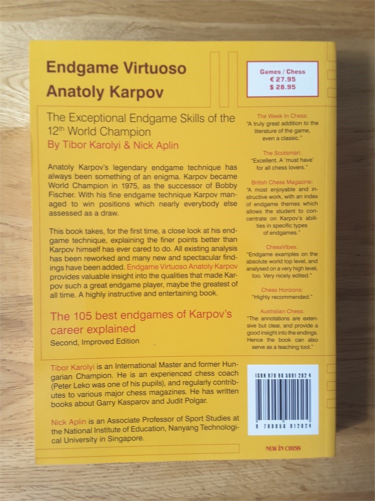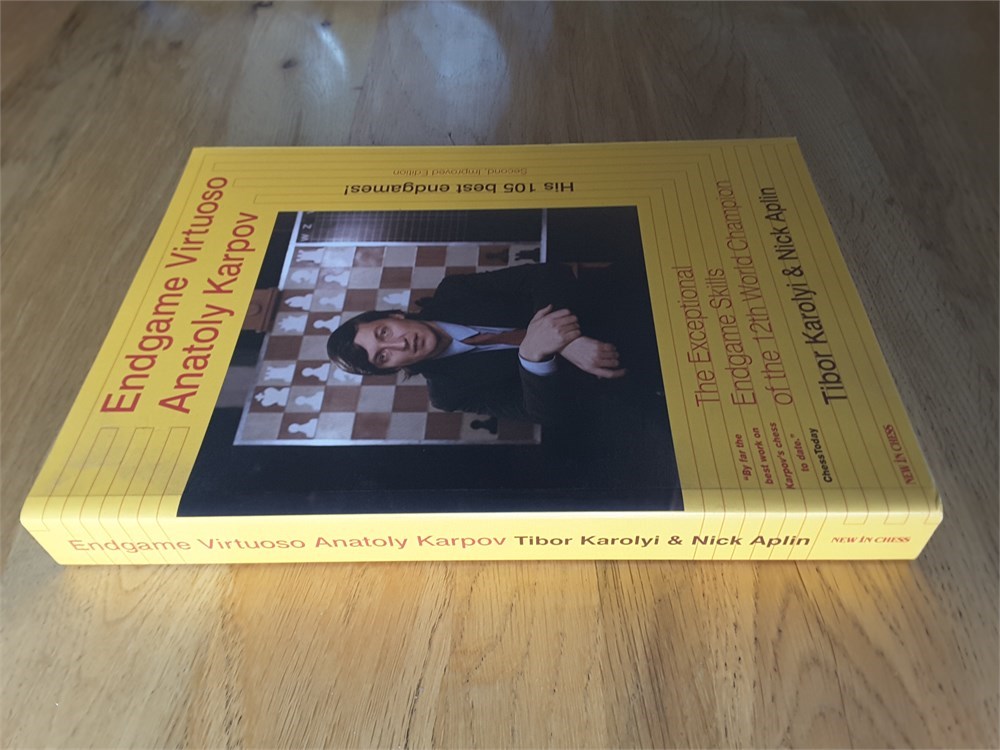 "Anatoly Karpov: Endgame Virtuoso" by Tibor Karolyi & Nick Aplin. Published in softback by New In Chess in 2007. Revised Edition. 358 large pages. In figurine algebraic notation. Near Fine, unread condition. Condition Rating: 9/10. Actual book covers are more orangey in colour than the scanned images depict. I have refrained from taking any pictures of this book's interior as it is obvious that this volume has been very well cared for over the years and I do not want to bend the spine back. Any questions, please just ask.
