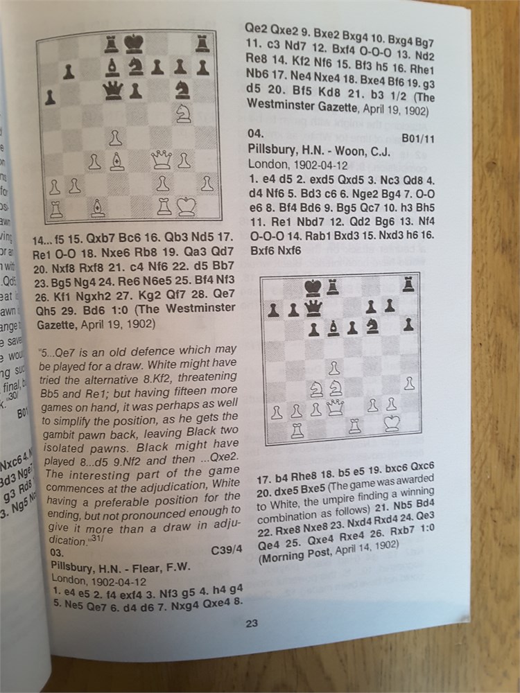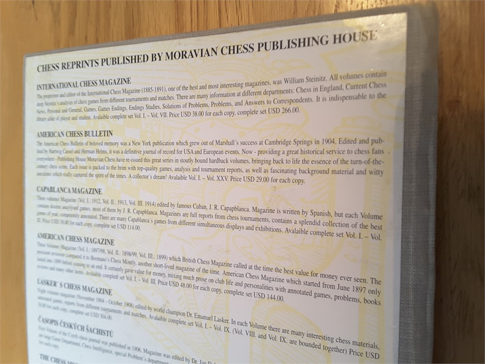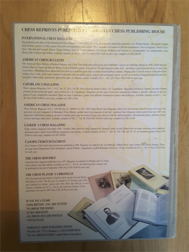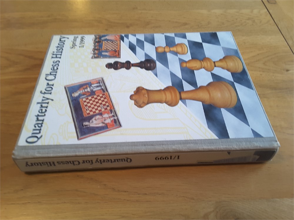 "Quarterly for Chess History, Spring 1999" edited by V. Fiala. Published in hardback by Moravian Chess in 1999. 312pp. The book is in Good Plus condition for its age. The binding is tight although there is a very mild shelf lean present. The boards are clean. The rear board has some yellow lines on it that I'm unsure whether they are part of the original design of the book or they are discolouration. I'll try and take a couple of scans to show this accurately (see last two scans). The page edge blocks have very light evidence of age & handling. Internally the book is very clean and unmarked. It appears to be inscription, annotation and foxing free. Games are given in algebraic notation. Condition Rating: 7/10. Any questions, please just ask.