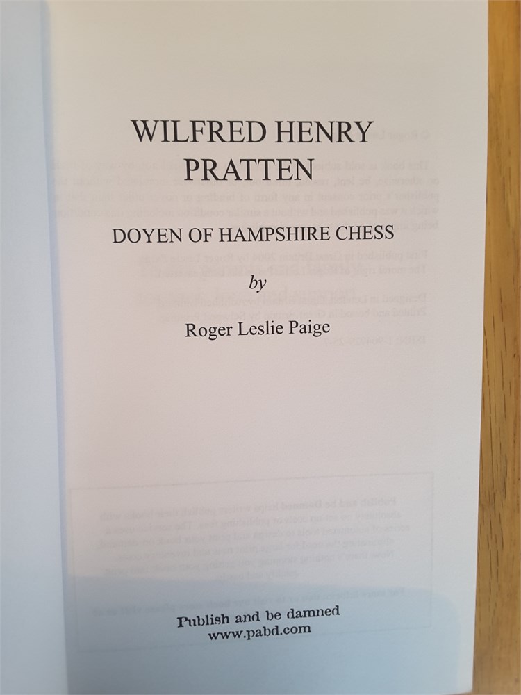 "Wilfred Henry Pratten: Doyen of Hampshire Chess" by R. Paige. Published in softback by PABD in 2004. 219pp. The book is in Very Good Plus condition. The covers are very clean and bright with no sunning evident. The page edge blocks are clean. Internally the book is very clean and unmarked. It feels largely unread. It is inscription, annotation and foxing free. Scarce. Games are given in algebraic notation. NOTE: For non-UK members of LSAK, Hampshire is a county in Southern England. Condition Rating: 8.5/10. Any questions, please just ask.