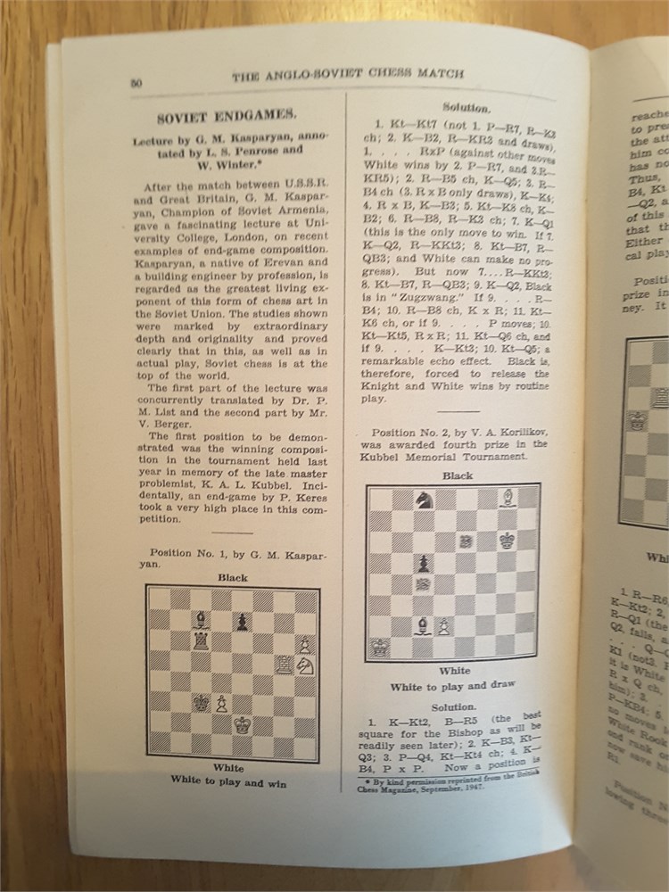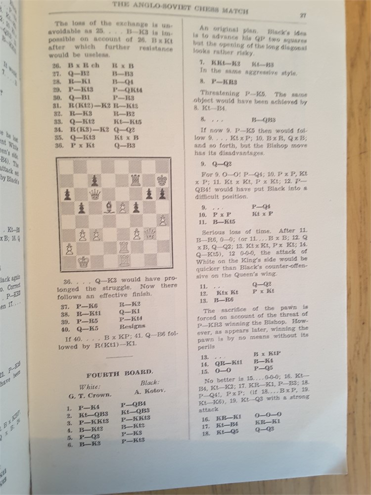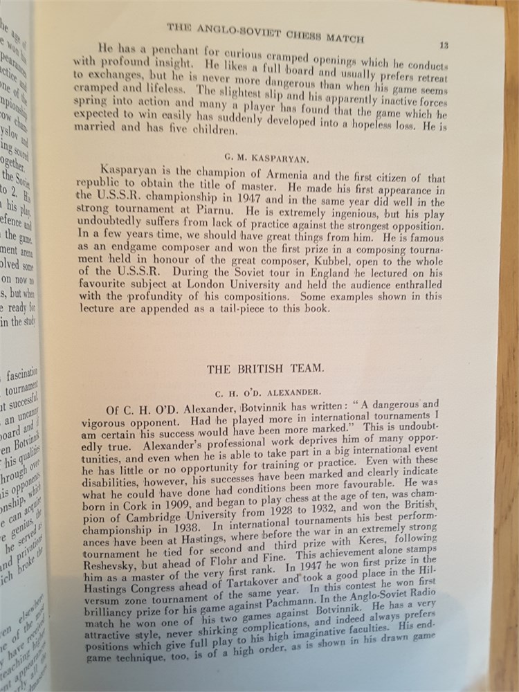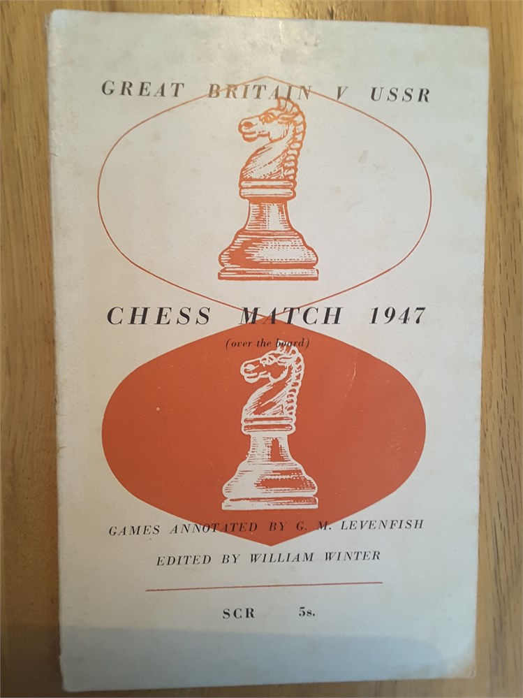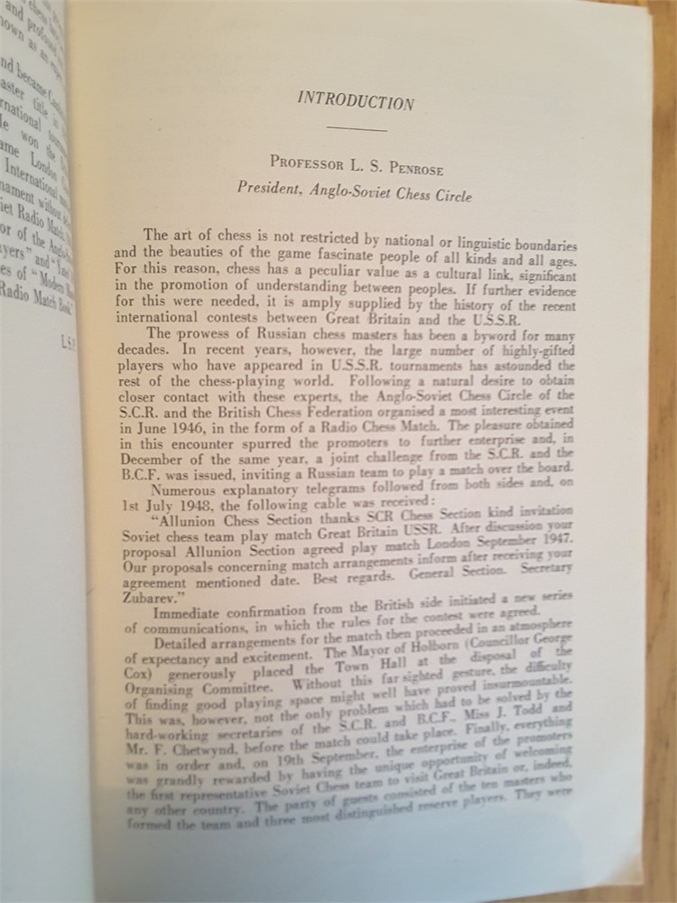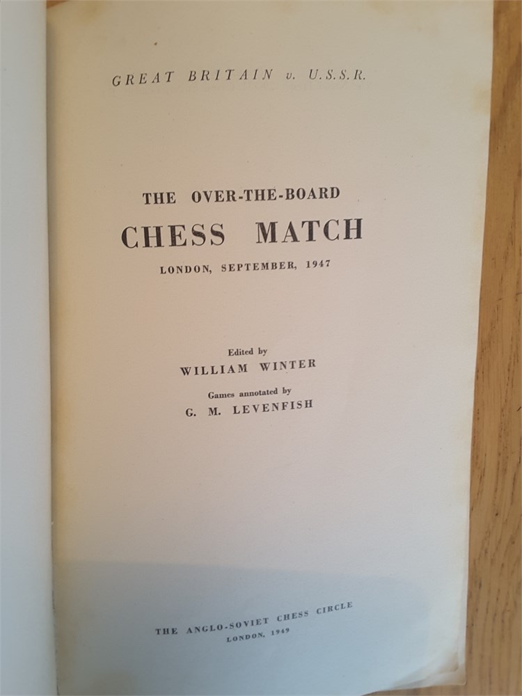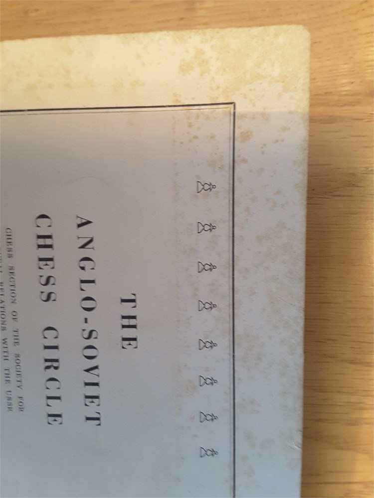 "Great Britain v USSR Chess Match, 1947" by G. Levenfish and W. Winter. Published in softback by the Anglo-Soviet Chess Circle in 1949. 54pp. Betts 26-12. The booklet is in Good condition for its age. The covers are reasonably clean (a little rubbing, commensurate with age) although there are a couple of creases to note plus a foxing-like speckling particularly on the rear cover. There is a small area of superficial loss at the foot of the spine (see scans). The page edge blocks are tanned from age and handling. Internally the booklet is clean and unmarked but has a fragile feel as though pages are not securely attached to the spine (a common enough occurence with vintage glue binding). The paper available so relatively soon after WW2 was not the best but the publishers must have searched around as the paper quality in this booklet is remarkably good for that era. The internal pages are all very clean and unmarked and all appear to be inscription and annotation free. Games are given in English descriptive notation. Scarce. Condition Rating: 7/10. Any questions, please just ask.