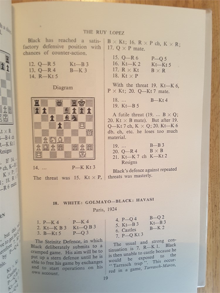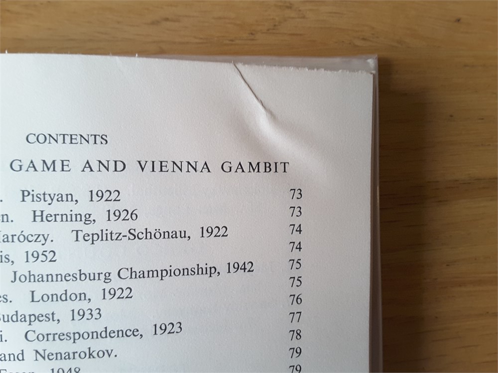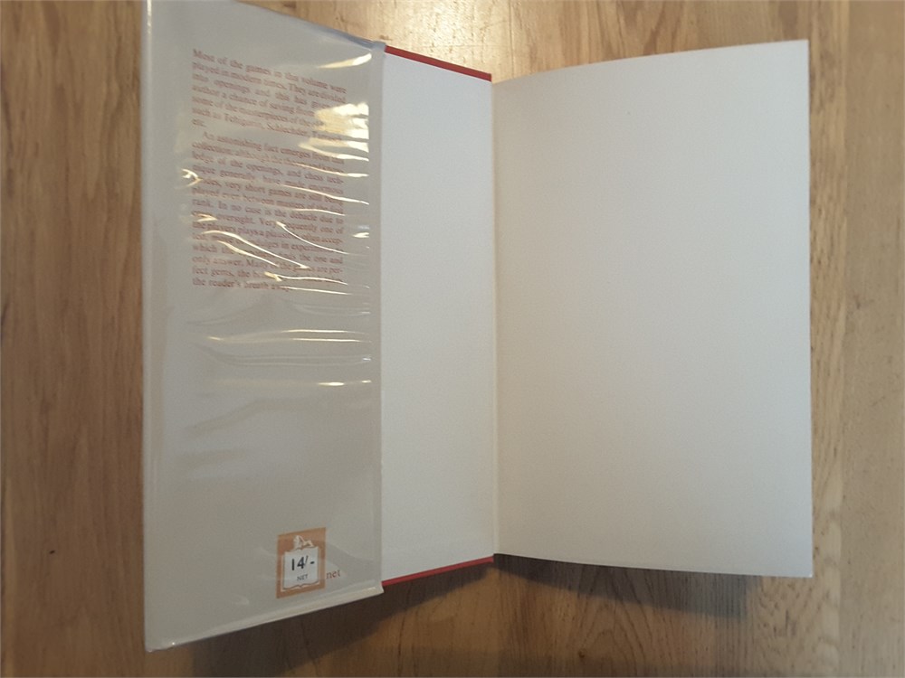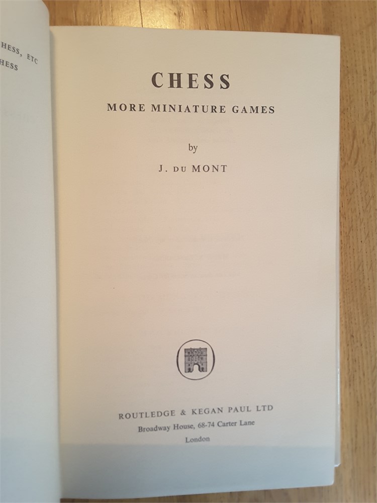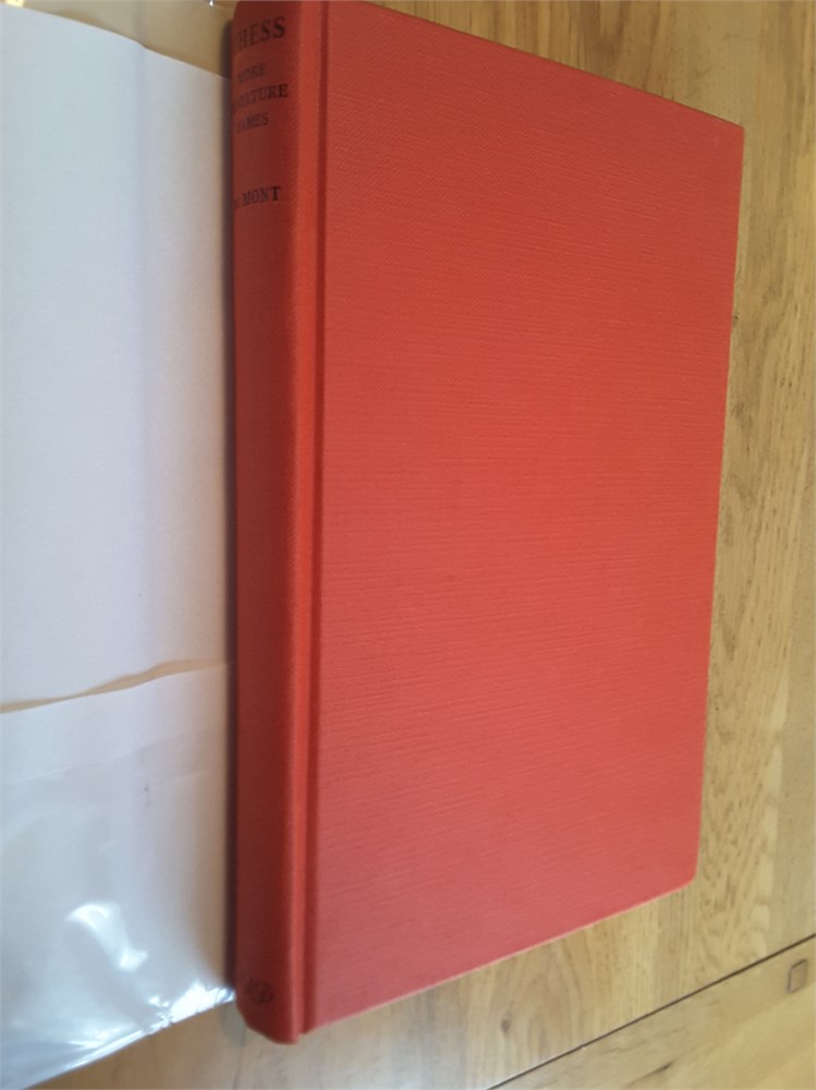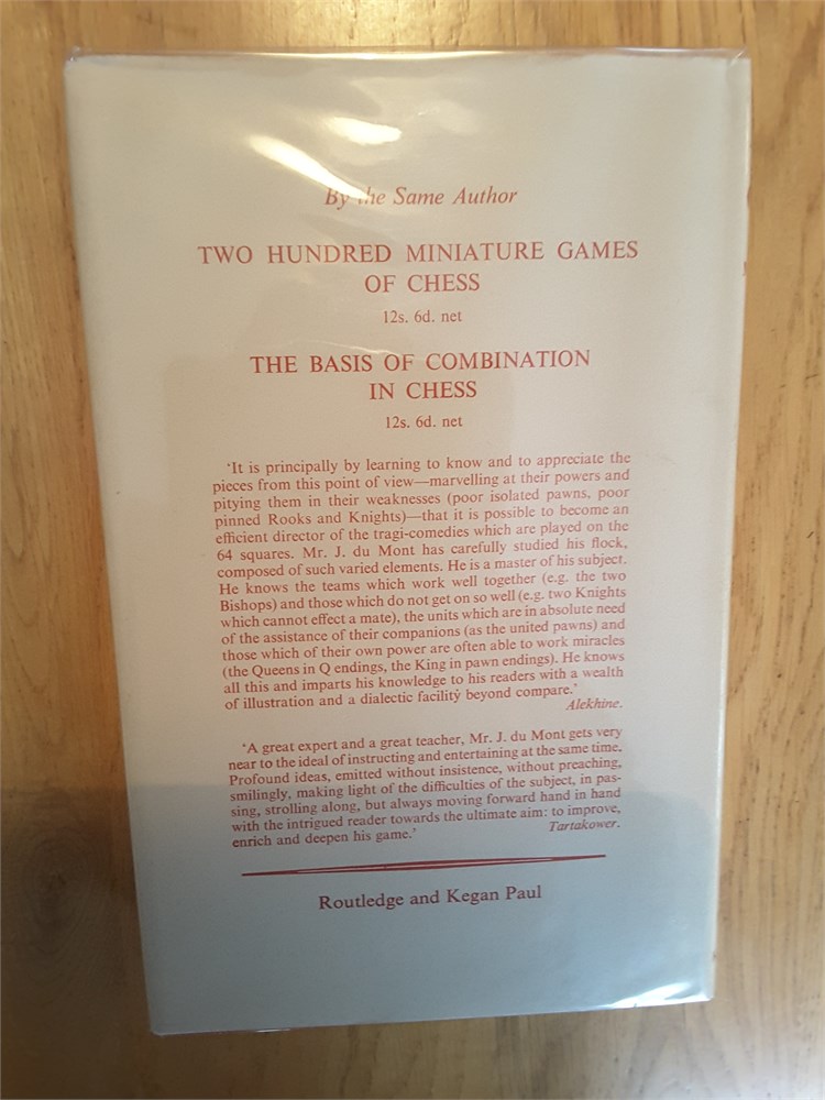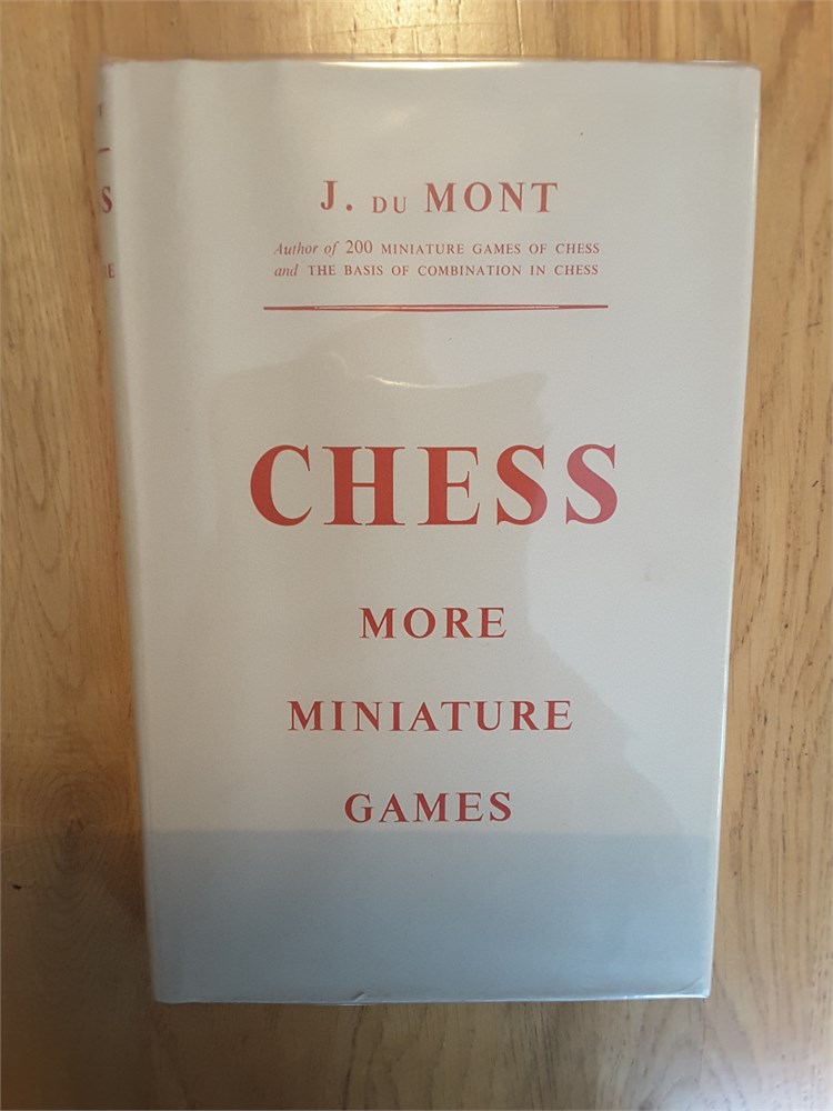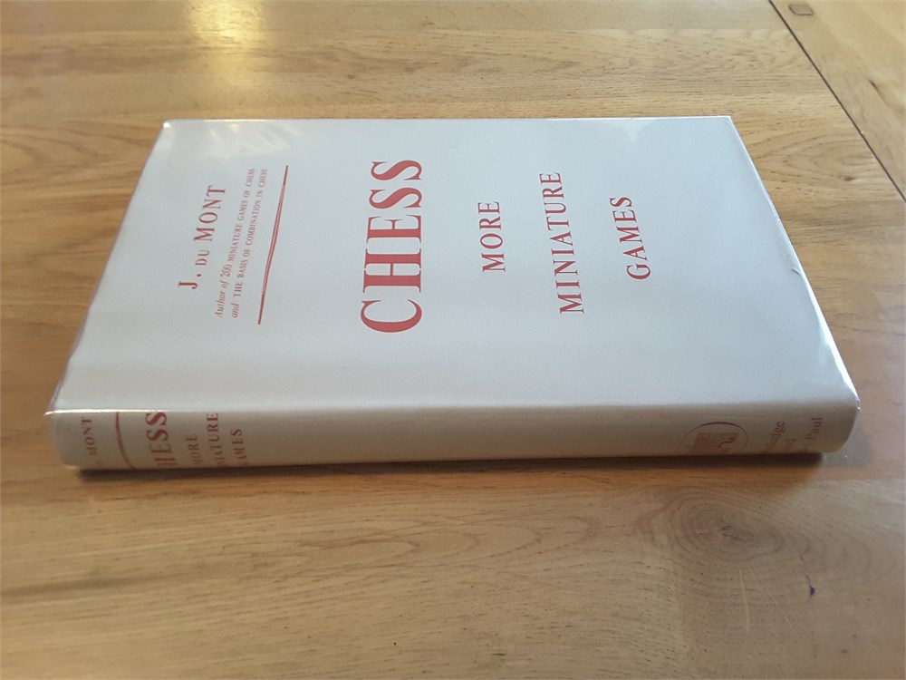 "More Miniature Games" by J. du Mont. Published in hardback by RKP in 1953. 222pp. I'm unable to locate in Betts. The book is in Very Good condition for its age. The binding is tight with no bowing present although there is a mild shelf lean with resultant spine cocking. The boards are very clean. The page edge blocks are tanned but clean. Internally the book is in Very Good clean and unmarked condition. It has clearly been very well cared for over the years and appears to be largely unread. It is inscription, annotation and foxing free. There is a small crease on pages ix and x (see scan). The dustjacket is in Good Plus (nearly VG) condition for its age. It has mild crumpling with miniscule loss at the head of the spine plus light creasing and rubbing, less than commensurate with age. There is a shop sticker on the front flap. The dustjacket is now protected by a removable see-through sleeve. Games are given in English descriptive notation. Condition Rating: 8/10. Any questions, please just ask.