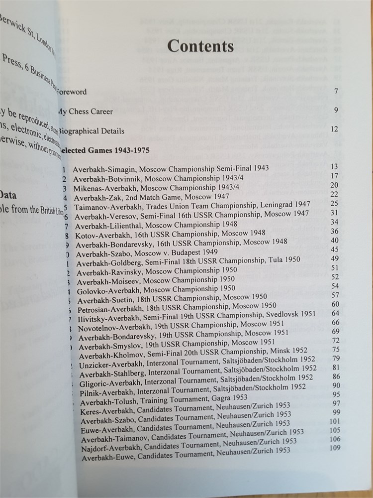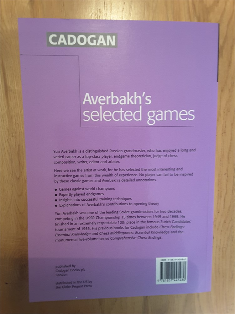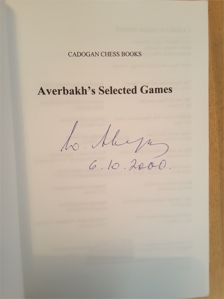"Averbakh's Selected Games [of Chess]" by Y. Averbakh. Published in softback by Cadogan Chess in 1998. 192pp. SIGNED BY AVERBAKH. The book is in Very Good condition for its age. The covers are very clean and bright with just a hint sunning evident to the spine area. The page edge blocks are clean with just a couple of tiny age-related specks evident. Internally the book is very clean and unmarked. It is inscription, annotation and foxing free. It feels largely unread and there are no creases visible along the spine area. The covers rise very slightly from the book having been opened and closed (see scan). The Averbakh signature is in pen on the front endpaper and dated Oct 2000. Games are given in figurine algebraic notation. Condition Rating: 8/10. Any questions, please just ask.