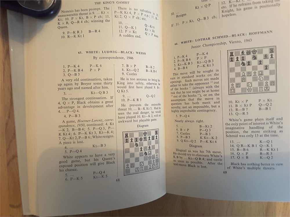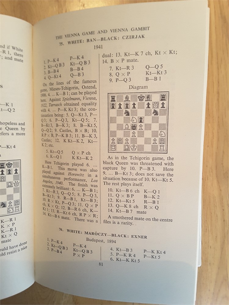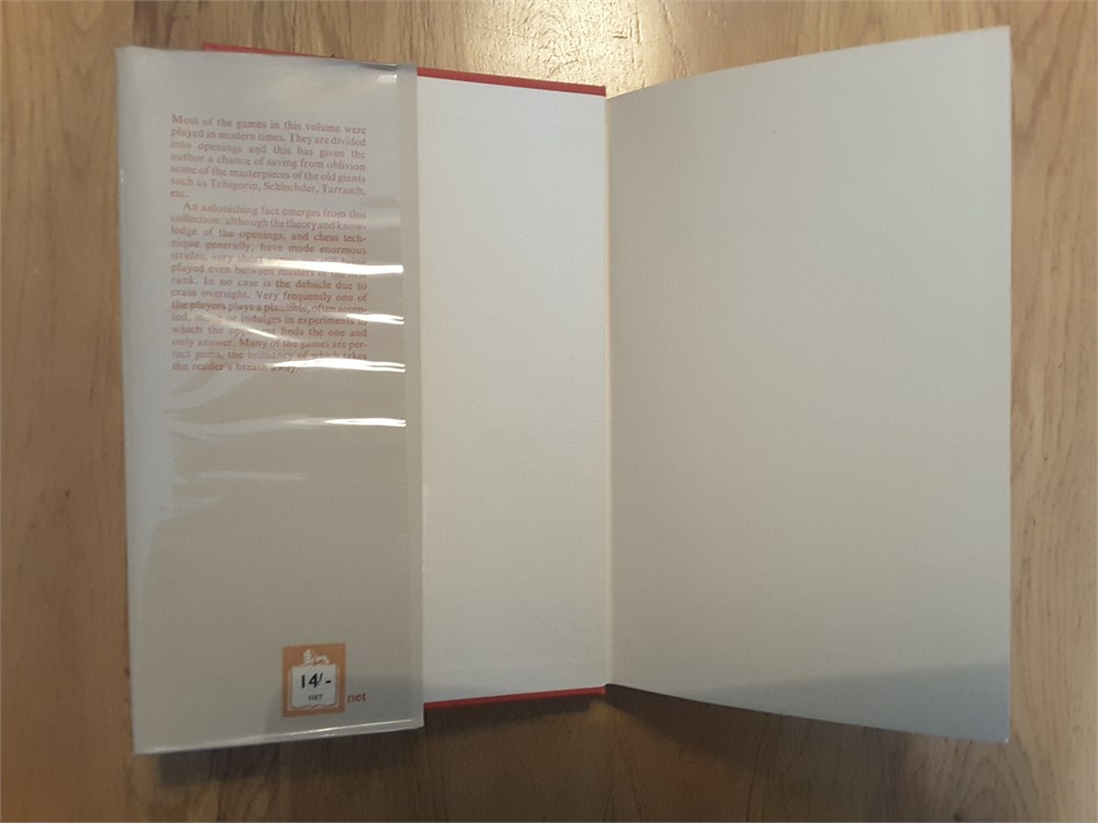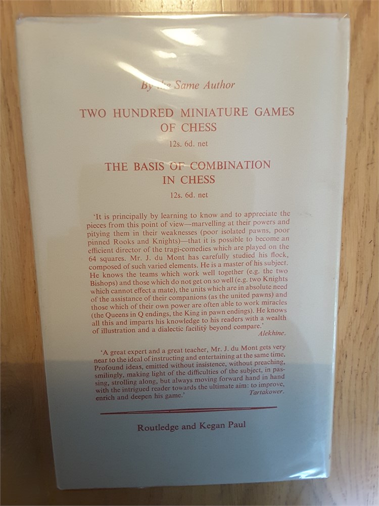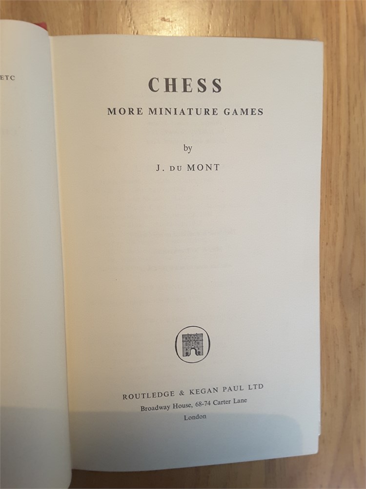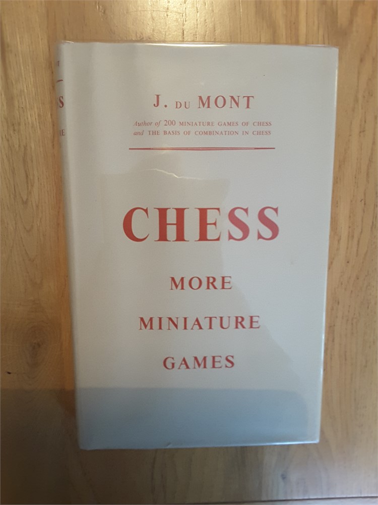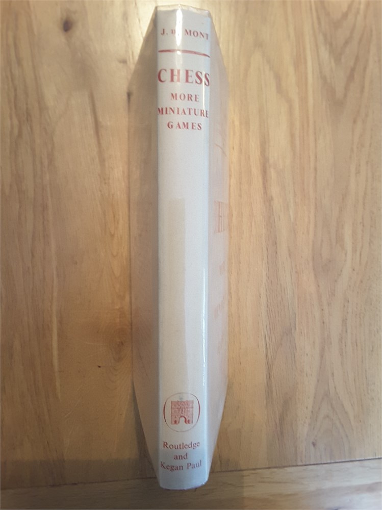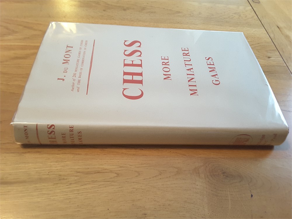 "More Miniature Games" by J. du Mont. Published in hardback by RKP in 1953. 222pp. I'm unable to locate in Betts. The book is in Very Good condition for its age. The binding is tight with no bowing present although there is a mild shelf lean with resultant spine cocking. The boards are very clean. The page edge blocks are tanned but clean. Internally the book is in Very Good clean and unmarked condition. It has clearly been very well cared for over the years and appears to be largely unread. It is inscription, annotation and foxing free. There is a small crease on pages ix and x (see scan). The dustjacket is in Good Plus (nearly VG) condition for its age. It has mild crumpling with miniscule loss at the head of the spine plus light creasing and rubbing, less than commensurate with age. There is a shop sticker on the front flap. The dustjacket is now protected by a removable see-through sleeve. Games are given in English descriptive notation. Condition Rating: 8/10. Any questions, please just ask.