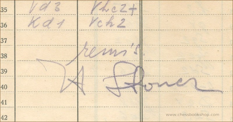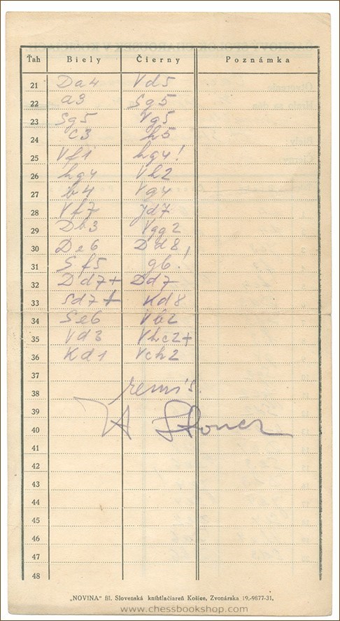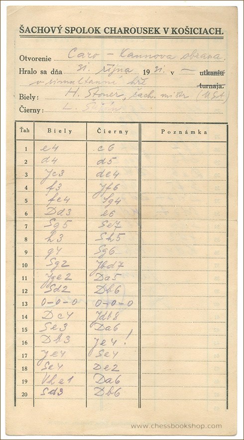 The scoresheet has a header of chess club Charousek in Kosice (Slovakia). The scoresheet is written in pencil in Stepan’s hand, signed by Herman Steiner. Size ca 22.5 x 12.5 cm. 10 grams