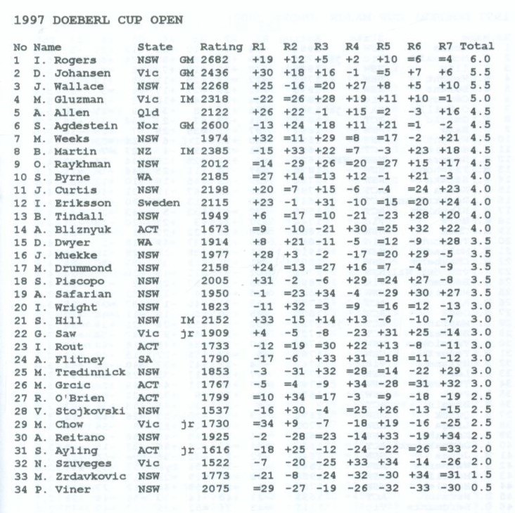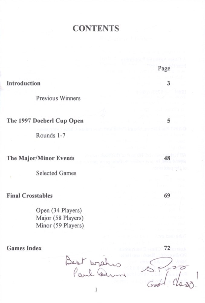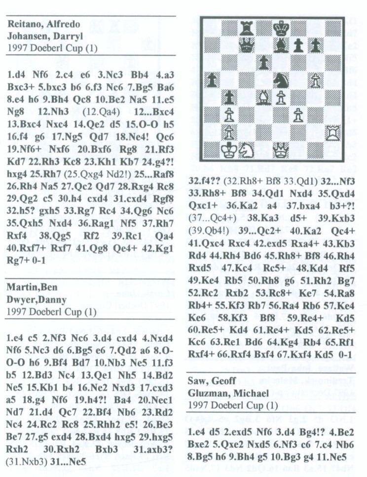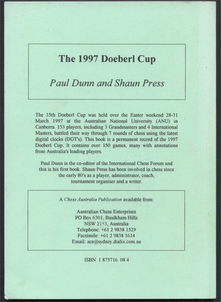 The 35th Doeberl Cup was held over the Easter weekend 28-31 March 1997 at the Australian National University (ANU) in Canberra. 153 players, including 3 Grandmasters and 4 International Masters, battled their way through 7 rounds of chess using the latest digital clocks (DGT's). This book is a permanent record of the 1997 Doeberl Cup. It contains over 150 games, many with annotations from Australia's leading players.