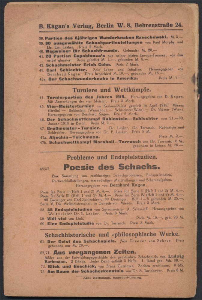 Publisher: Schachverlag Bernhard Kagan, Berlin.