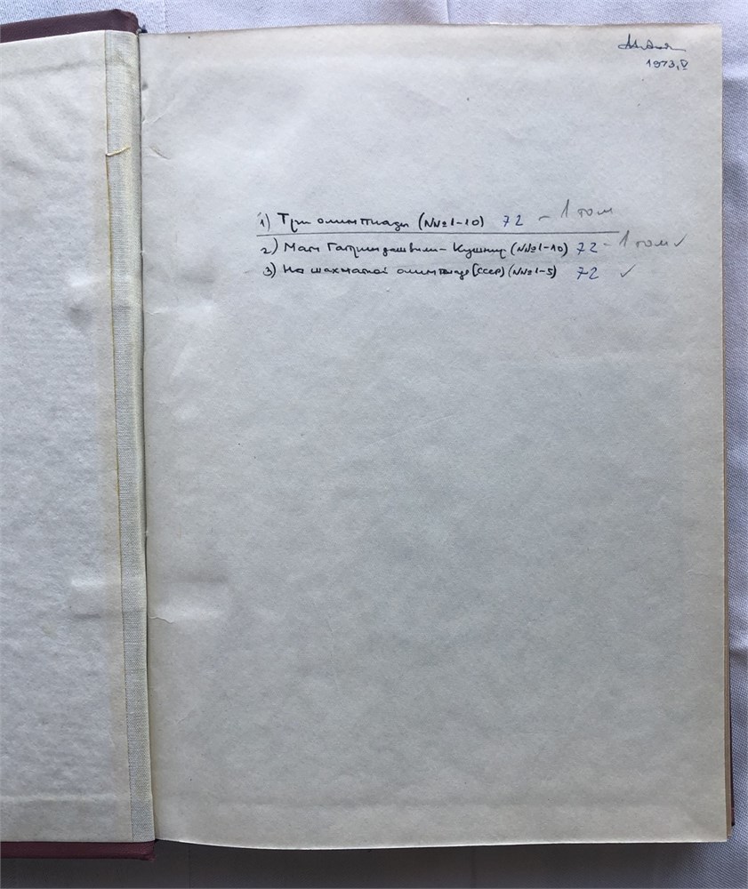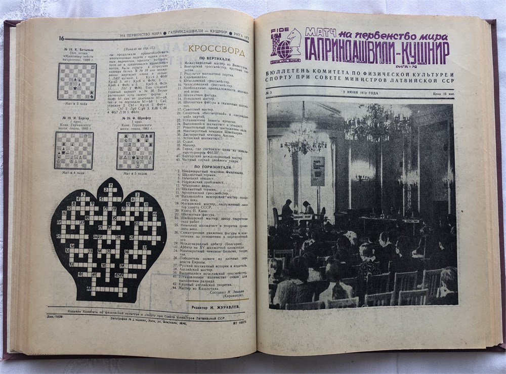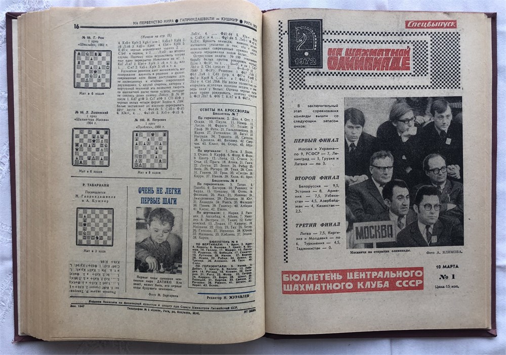 Bound together with Women’s World Championship Chiburdanidze–Kuzmin, 10 bulletins and USSR Team Championship (Trade Union), 5 bulletins. 28 x 20 cm. Red plastic binding with title vignette on the spine.