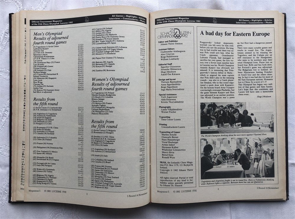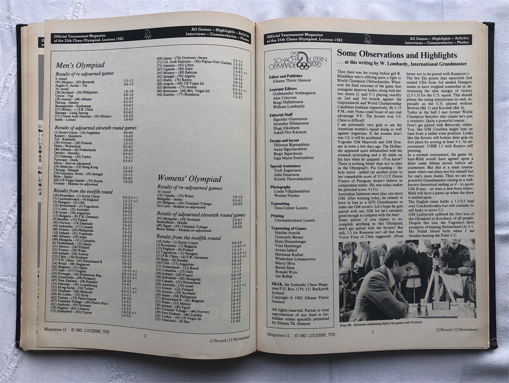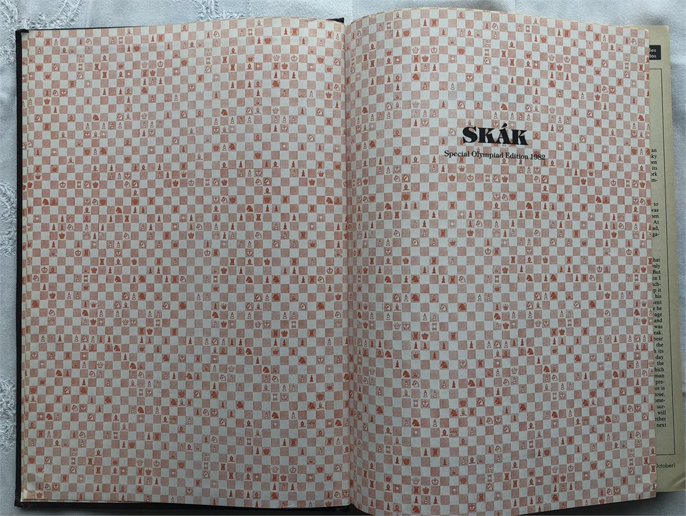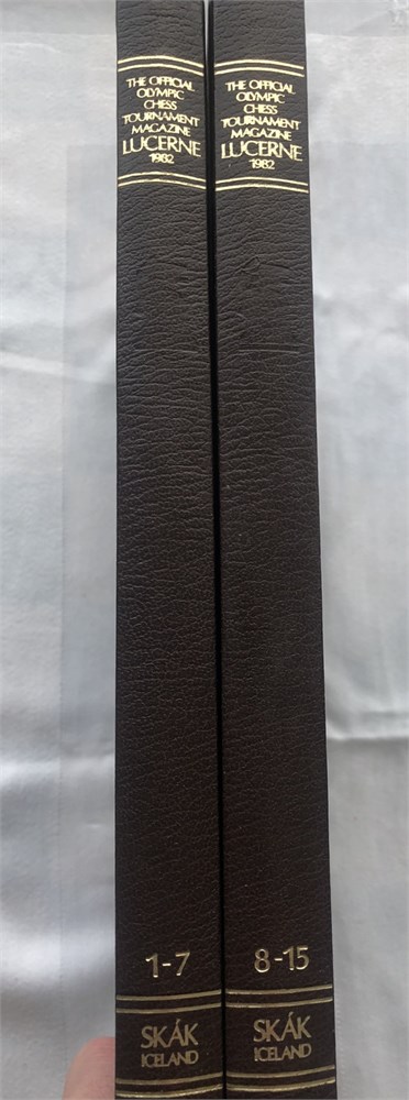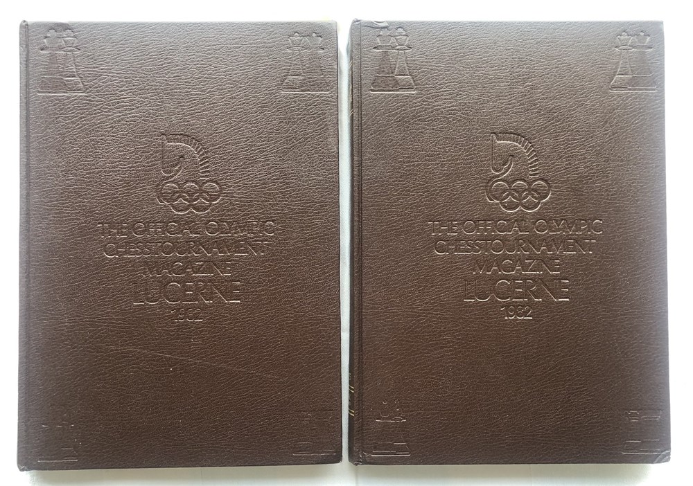 SKÁK, intaglio print on frontcover: "The official olympic chesstournament magazine.Lucerne 1982" 2 Volumes. ca. 15x48 = 720 pages. Original imitation leather binding with intaglio print and spine titles