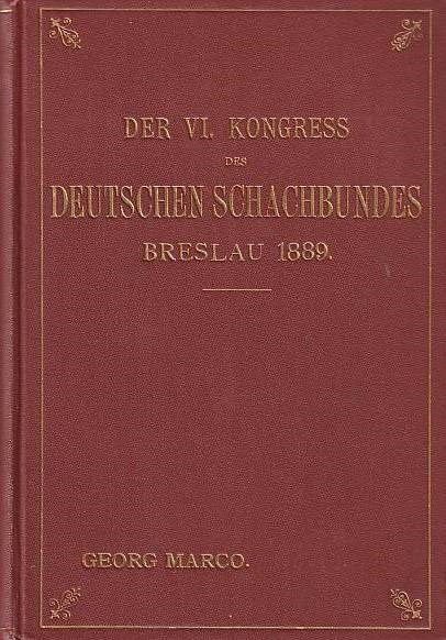 Breslau 1889. Der sechste Kongress des Deutschen Schachbundes. Breslau 1889. The sixth congress of the German Chess Federation. Wroclaw 1889. With a frontispiece of S. Tarrasch. Congress report. Cross tables. Opening survey and index. Table of content. All 153 games with annotations in German. Many diagrams. 28 games from the minor tournaments. Tarrasch won in front of Burn and Mieses. Problems from the problem tournament including the solutions. 287 pages. 1 leaf. Leipzig, Veit, 1890. L/N 5229.