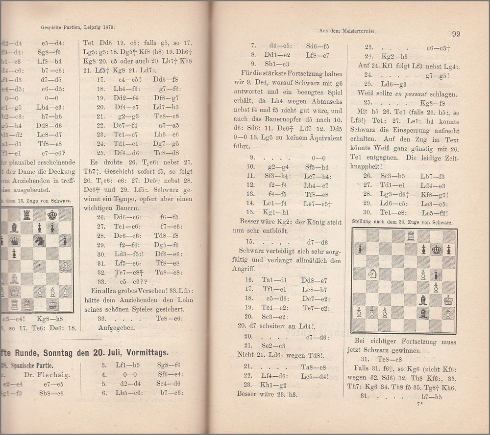 Leipzig 1879. Berlin 1881. Der erste und zweite Kongress des Deutschen Schachbundes. Leipzig 1879 - Berlin 1881. The first and second Congress of the German Chess Federation. Leipzig 1879 - Berlin 1881. With a portrait of H. Zwanzig and some diagrams. Algebraic notation. 39 of 66 games from the tournament in Leipzig with annotations in German. 1 Consultation game and six games from a match between L. Paulsen and A. Schwarz. All 136 games from the tournament in Berlin with very rare annotations in German. Congress reports, statutes. Cross tables. Opening indexes. Winning problems from the problem tournaments during the congresses. VIII, 228 pages. 1 leaf with "Berichtigungen". English won in Leipzig 1879 in front of L. Paulsen. Blackburne won In Berlin 1881 in front of Zukertort. Leipzig, Veit, 1883. L/N 5210.