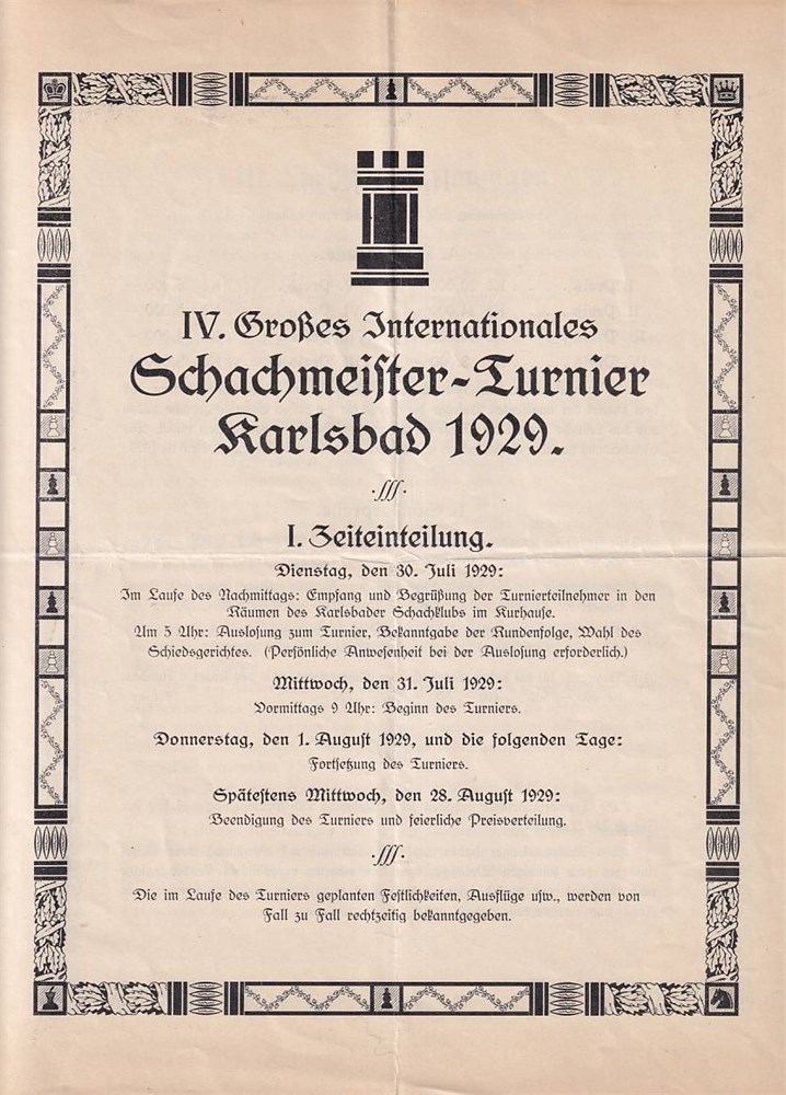 The Karlsbad 1929 chess tournament, held in Karlovy Vary, Czechoslovakia, from August 30 to October 29, was one of the strongest events of the interwar period. It brought together twenty-two leading masters, including José Raúl Capablanca, Rudolf Spielmann, Efim Bogoljubov, Akiba Rubinstein, and Salo Flohr. The tournament was won by Aarón Nimzowitsch with 15 points out of 21, narrowly ahead of Capablanca and Spielmann. His victory was seen as a major triumph for the hypermodern school of chess, which emphasized control of the center with distant pieces rather than direct occupation. The event is remembered for its high-quality strategic play and as one of the last great classical tournaments before the disruptions of the 1930s and World War II.