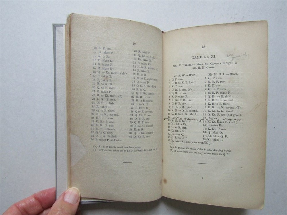 Small octavo, rebound in grey boards with dark red cloth spine. Marginal tear repaired, some pencil notes, pp iv, 143. 100 games with brief notes, "recently played, either between the best players in that society, or by them with other celebrated players of the day." Includes a list of subscribers accounting for 168 copies. A very scarce book in good condition. Williams was one of the leading English players of his time, and took 3rd prize at the 1851 London tournament. LN 3147.