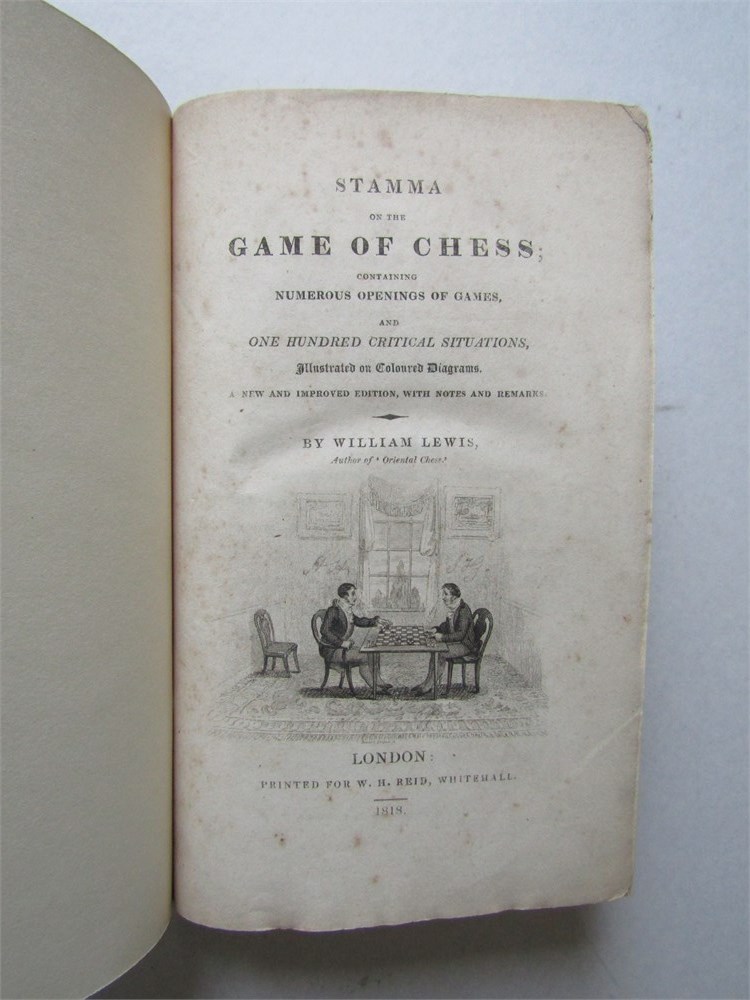 Lewis (William): Stamma on the Game of Chess; containing Numerous Openings of Games, and One Hundred Critical Situations, Illustrated on Coloured Diagrams. A New and Improved Edition, with Notes and Remarks. W.H.Reid, 1818. First Edition. Later brown half leather, spine gilt-ruled with red title-label, marbled sides, page edges uncut. A very nice copy. Title-page with small engraving, 100 diagrams printed in green, red and black, pp xii, 337, 2 (adverts). Occasional light foxing. LN 428. An early use of colour printing for practical purposes. A translation of Stamma's "Essai sur le jeu des Echecs" (1737).