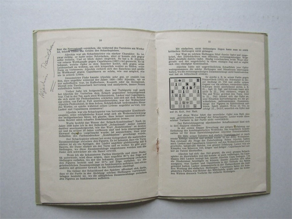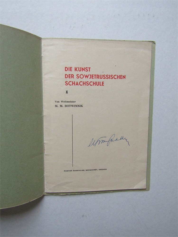 Botvinnik (M.M.): Die Kunst der Sowjetrussischen Schachschule. Herausgegeben V.L.Toth. Magyar Sakkvilag, Kecskemet, n.d. (1949) Original paper covers, with added plain card covers, a few pencil marks or underlining otherwise very good. 20pp. LN 1747. SIGNED BY BOTVINNIK ON FRONT PAPER COVER. A scarce item.
