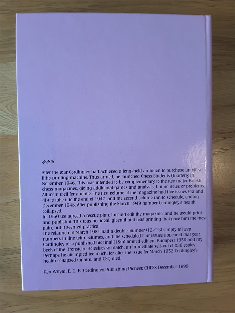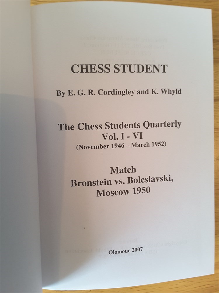 "Chess Student" by E. Cordingley & K. Whyld. Published in hardback by Moravian Chess in 2007 as a facsimile reprint of the 'Chess Students Quarterly' editions between 1946-52. 568pp. The book is in Near Fine condition. Internally it is very clean and looks and feels unread. Published in a pictorial cover without a dustjacket. Games are given in a mixture of English descriptive notation and algebraic notation. Scarce. Condition Rating: 9/10. Any questions, please just ask.