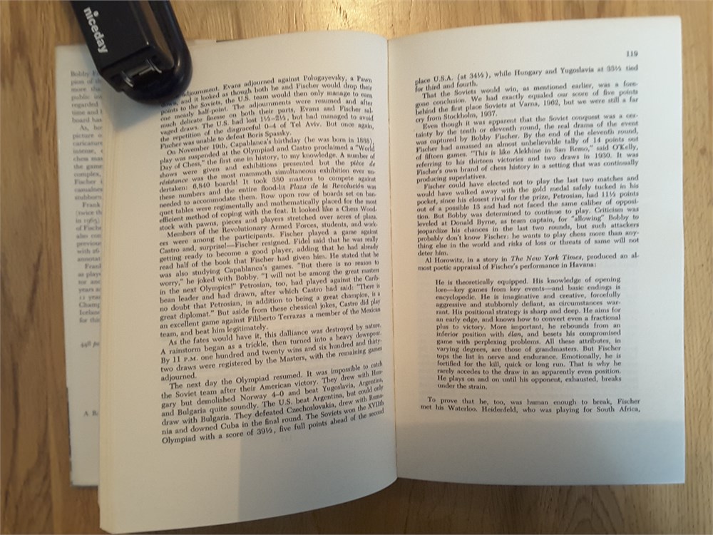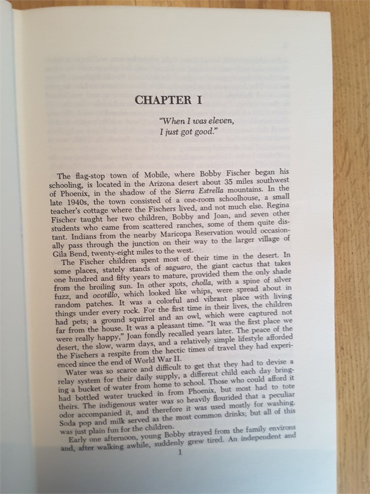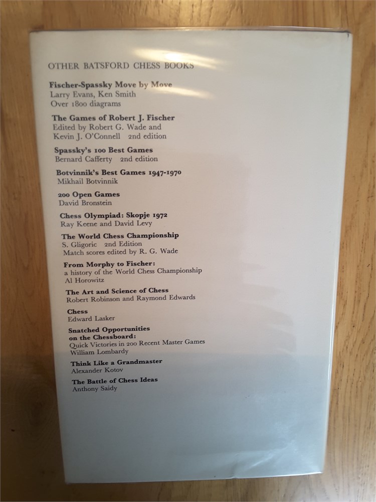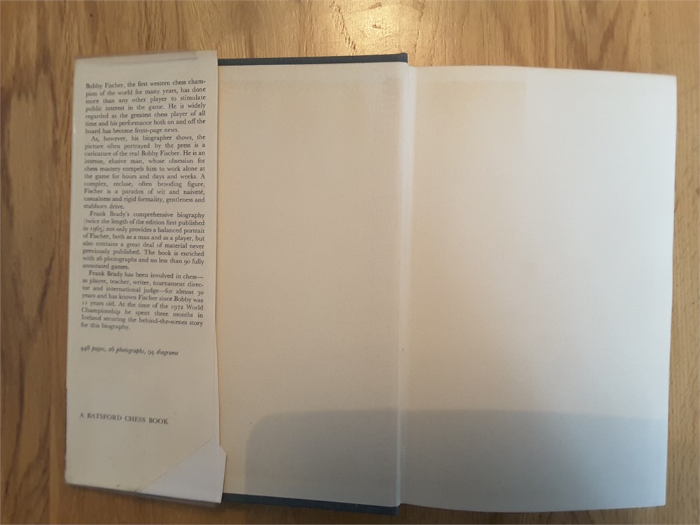 "Bobby Fischer" by Frank Brady. Published in hardback by Batsford in 1974. First UK Edition. 435pp. The book is in Very Good condition for its age. The binding is tight and there is no shelf lean or bowing present. The boards are very clean. The gilt lettering on the spine is still strong. The page edge blocks are clean and just a little tanned from age. Internally the book is in very good condition with clean and unmarked pages. It is inscription, annotation and foxing free. The dustjacket is also in Very Good condition. It is complete and suffers only from mild rubbing and a couple of miniscule nicks to the spine area. See scans. The dustjacket is now protected by a removable see-through sleeve. Games and positions are given in English descriptive notation. Condition Rating: 8/10. Any questions, please just ask.