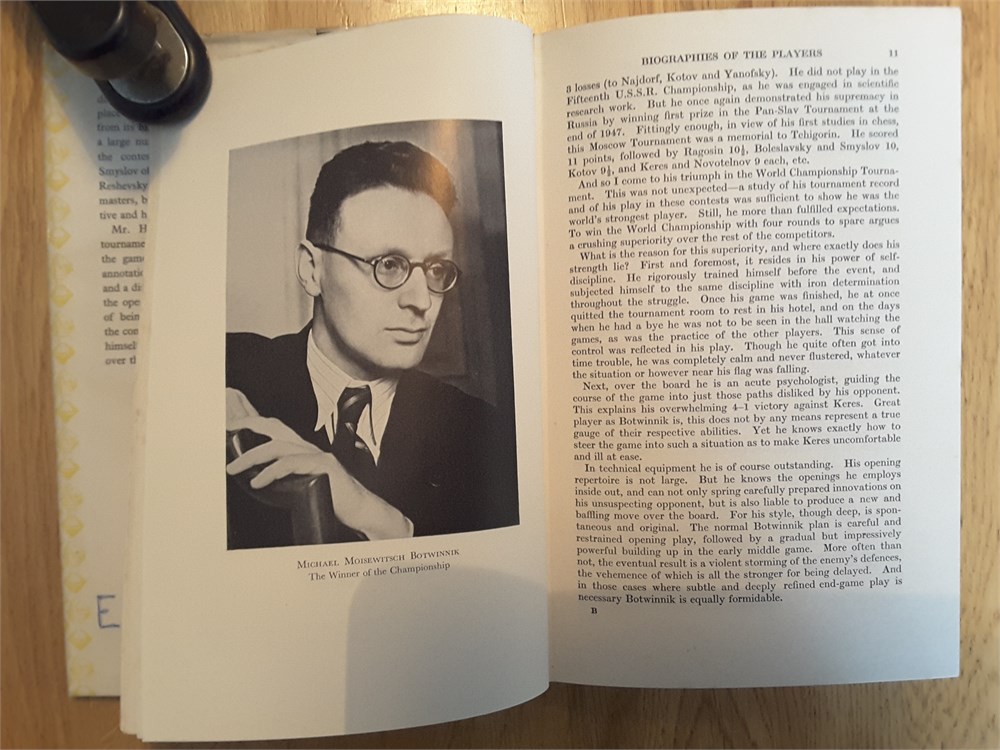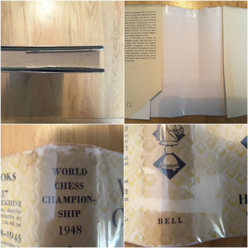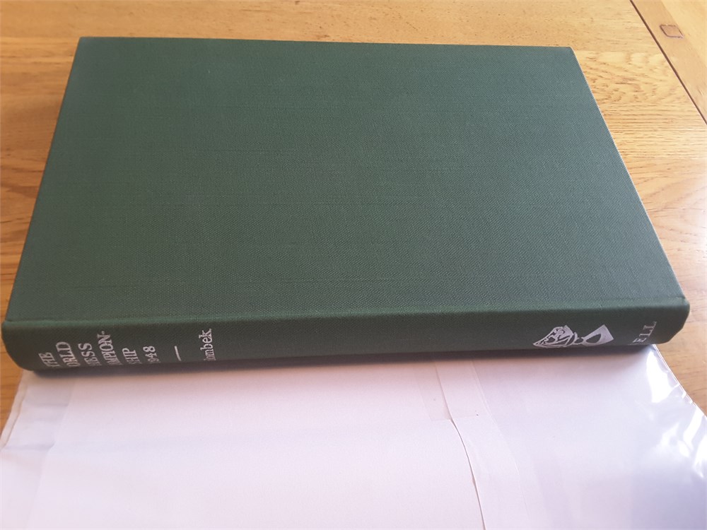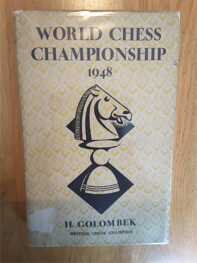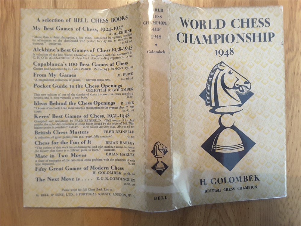 "The World Chess Championship, 1948" by Harry Golombek. Published in hardback by George Bell in 1949. First Edition. 226pp. Betts: 25-183. The book is in Very Good condition for its age. The binding is tight and there is no shelf lean or bowing present. The page edge blocks are tanned from age (the top edge darkened, as usual) and have mild, sporadic foxing present that does not extend onto any text pages. The silver lettering on the spine is still strong. The boards are very clean. Internally the book is in very good condition, clean and unmarked. The internal pages have tanned a little from age but are all very clean. The book is inscription, annotation and foxing free. The dustjacket is in Good Plus condition. It has some depredations, as follows: 1. A small area of loss at the head of the spine. 2. A tiny area of loss at the tail of the spine. 3. Superficial loss to the dustjacket on the lower spine area and the lower front panel area. 4. Discolouration along the spine. 5. Tiny chips and tears. 6. Price-clipped on the front flap with pen entry ("E.12"). 7. Mild age-tanning throughout. See scans. Despite these depredations this is an above average example of the dustjacket usually seen on this volume as the dustjacket was notoriously fragile from the poorer quality of paper available so relatively soon after WW2. The dustjacket is now protected by a removable see-through. Games are given in English descriptive notation. Condition Rating: Book: 7.5/10. Dustjacket: 6.5/10. Any questions, please just ask.