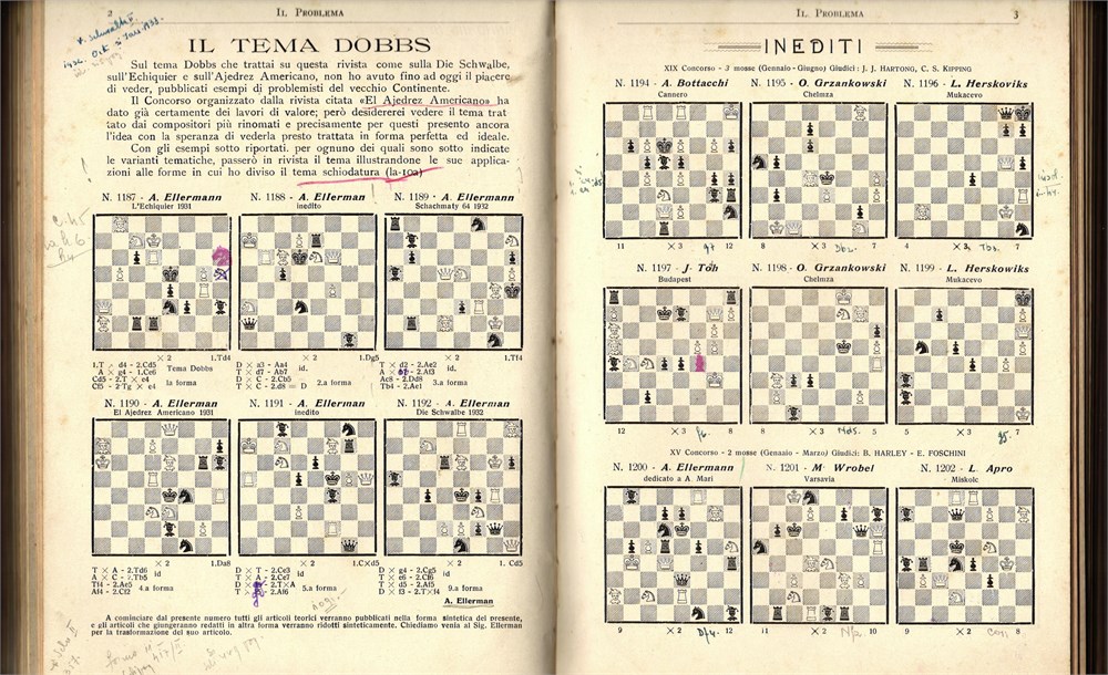 Condition: The magazines were bound in hard covers, but the front hard cover and the spine are missing! All the numbers have the covers, as well as the adjacent pages, which are not numbered. Several times stamped "Donatia W. PAULY, Martie 1934", which proves that this collection was part of the library of Wolfgang Pauly, one of the greatest chess problem composers of all time. Many annotations, most in pencil. Pages yellowed and sometimes may be dust (or possible water!?) stained, but all of these are not affecting the text. The text is a little affected in some damaged pages (but these were initially wrongly printed): pages 123, 126, 127, 146 of #9-10-11/1933 and before the page 153 of #12/1933. The last cover of #1/1932 is detached.