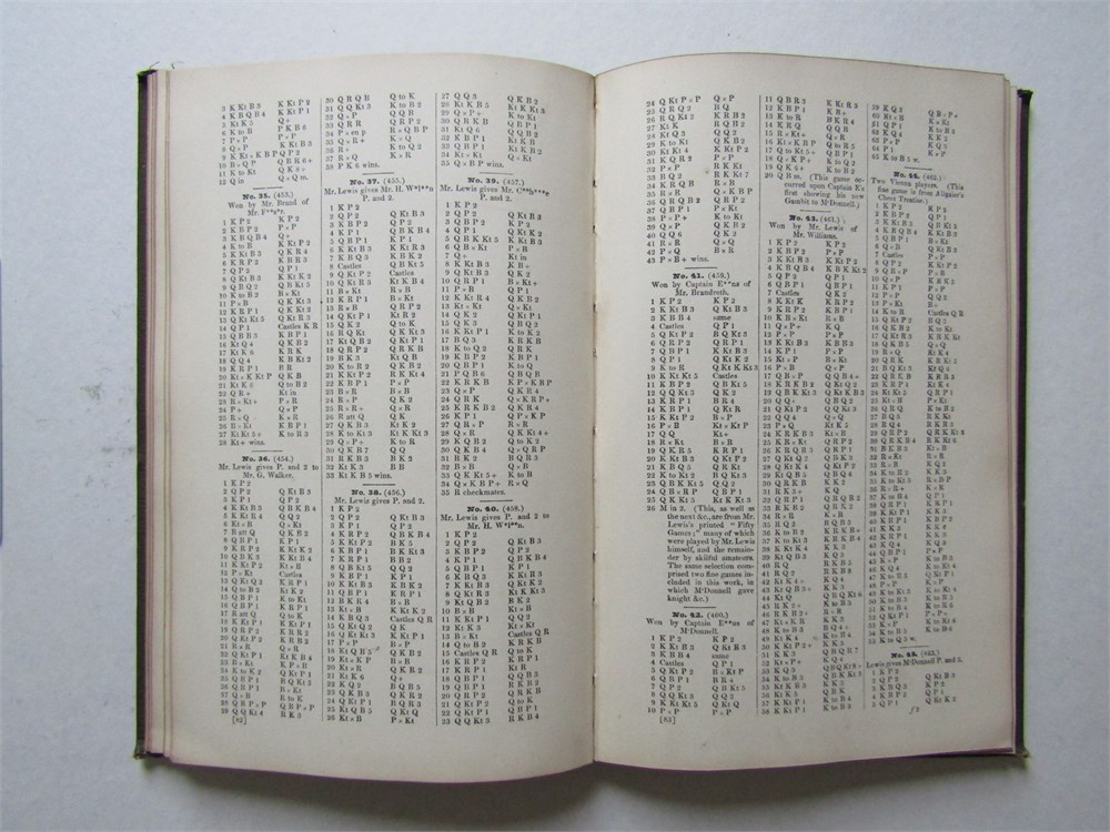 Roy8vo, original brown cloth, wear to top of spine otherwise a good copy. pp xvi,(172). 1020 games. "Walker established the custom of recording games, and his Chess Studies...has become a classic." (Oxford Companion.) Includes all 85 games from the Bourdonnais - McDonnell match, other games by these two players, 62 games by Philidor, 50 games by Mouret while conducting the automaton etc.. Same content as 1844 edition except with new introduction. LN 3146.