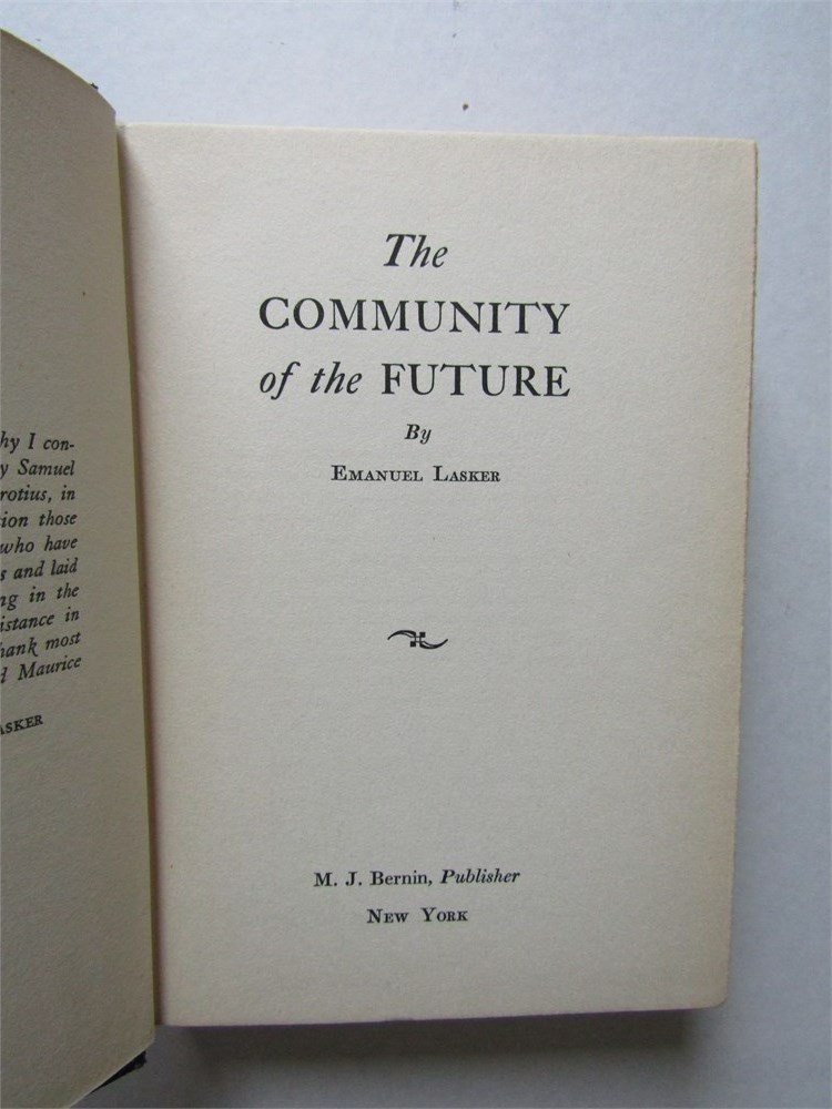 Lasker (Emanuel): The Community of the Future. New York, 1940. View Watchlist >