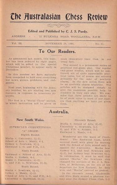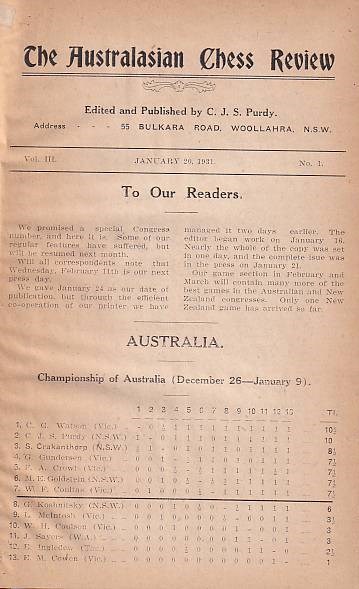 The Australasian Chess Review 1931 vol 3. Edited by C. J. S. Purdy. Woollahra, Purdy, 1931. With many diagrams. 304 pages. No Index. Hardback with gilt print on frontcover. L/N. 6382; Betts 7 - 70.