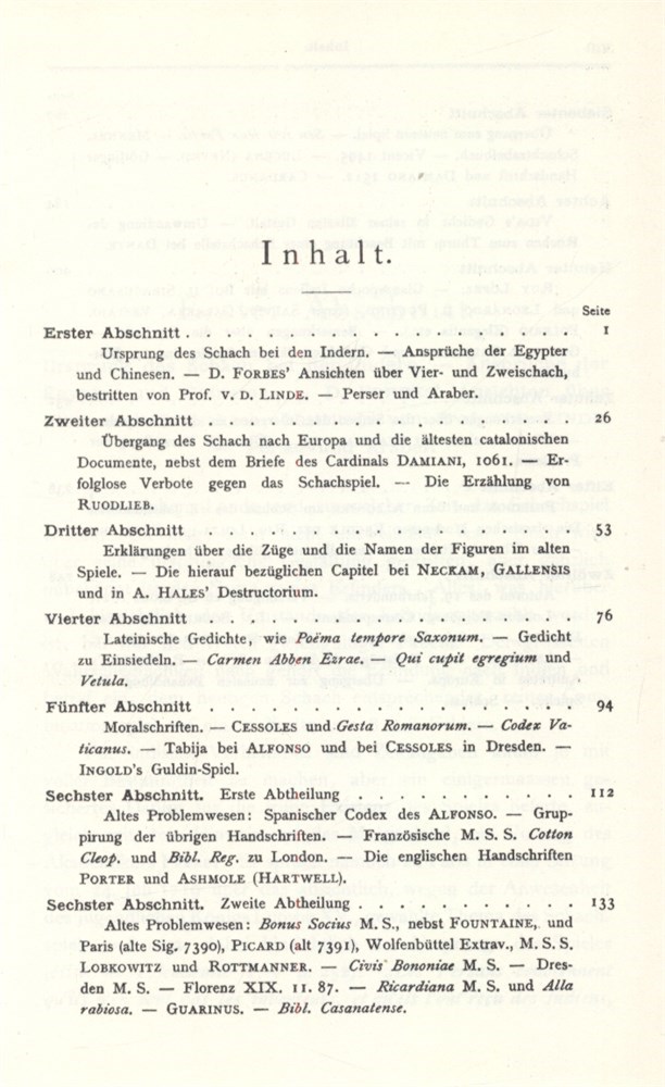 Twelve chapters in which von der Lasa describes the evolution on chess and literature of chess.