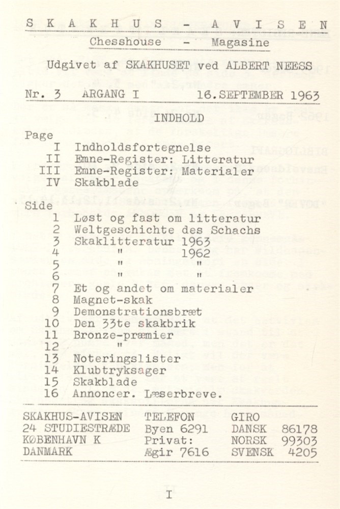 Alberth Neess opened the "Skakhuset" store in the centre of Copenhagen on August 16,1947. From a humble start, right after the Second World War, the shop grows and becomes a major centre in the Danish chess life. In the period 1963 to 1973, Skakhuset published a small magazine containing descriptions and prices of the products that were for sale.