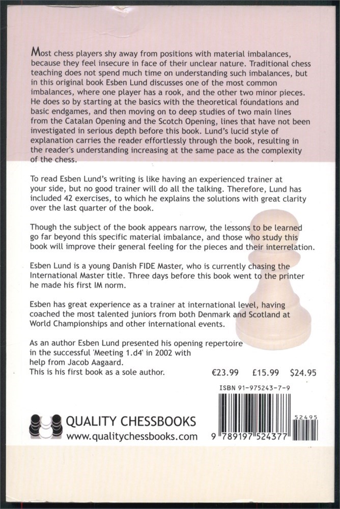 Description from cover (See scans for contents): Many chess players shy away from positions with material imbalances, because they feel insecure in the face of their unclear nature. Traditional chess teaching does not spend much time on understanding such imbalances, but in this original book Esben Lund discusses one of the most common imbalances, where one player has a rook, and the other two minor pieces. The author begins with basics, covering theoretical foundations and basic endgames and then moves on to deep studies of two main lines from the Catalan Opening and the Scotch Opening. Neither of these lines has been studied in such depth before. Lunds lucid explanations carry the reader effortlessly through the book, with the reader's understanding increasing at the same pace as the complexity of the chess.