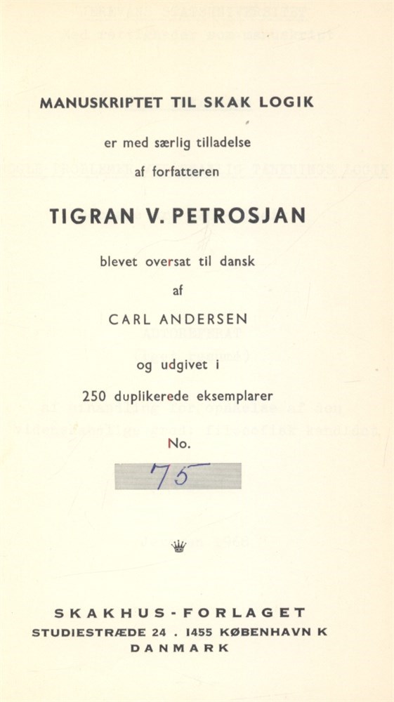 Publisher: Skakhus-Forlaget, Copenhagen 1968.