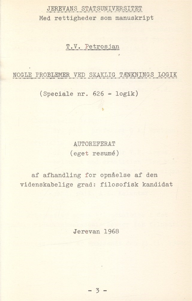 A resume in Danish on Petrosjan's thesis at the University in Yerevan. (Master of Philosophical Science)