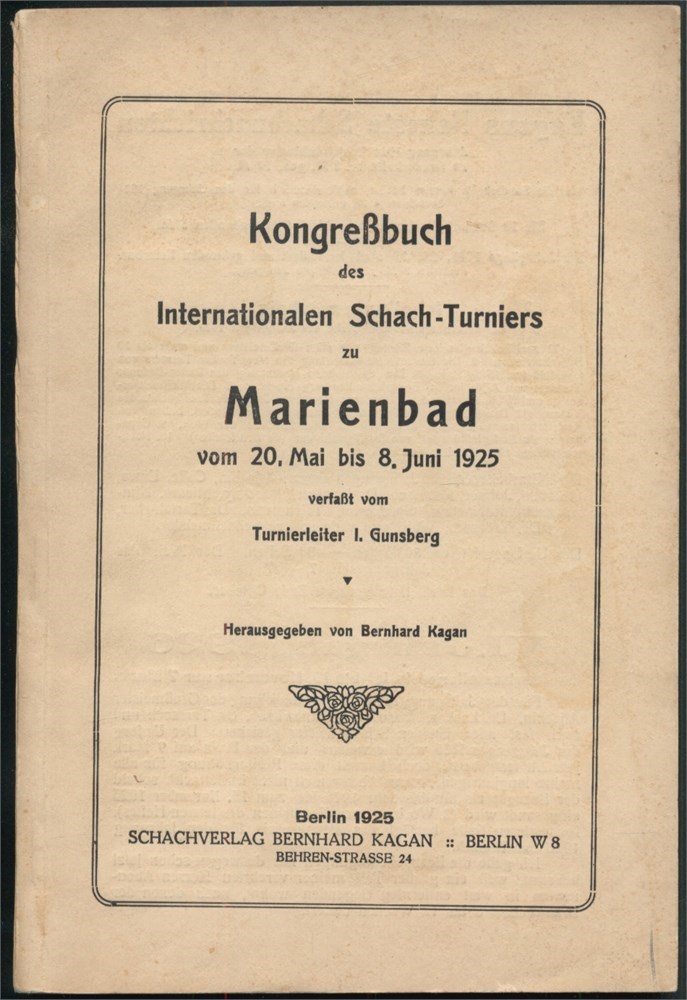Kongreßbuch des Internationalen Schach-Turniers zu Marienbad vom 20. Mai-8. Juni 1925 verfaßt vom Turnierleiter I. Gunsberg. 4 plates with 10 photos.