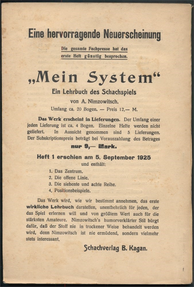 Publisher: Schachverlag Bernhard Kagan, Berlin 1925.